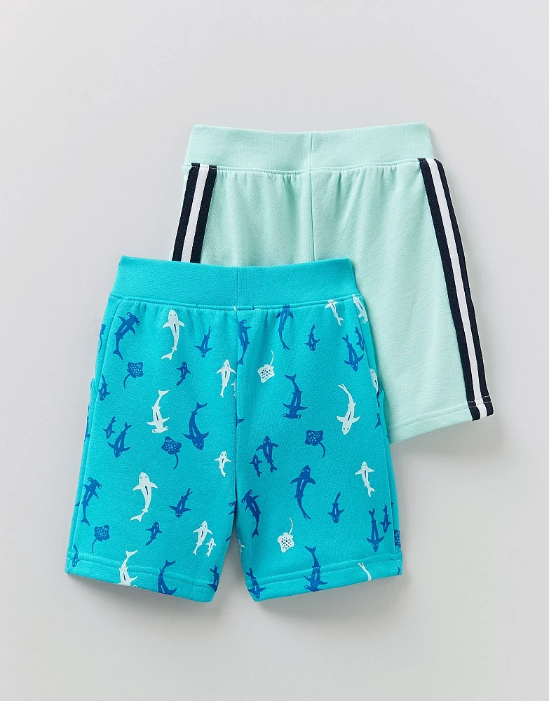 A two pack of jersey shorts. One in a shark print, one with sporty stripes down the side… get the best of both worlds with this set. They’re comfy and look super cool.