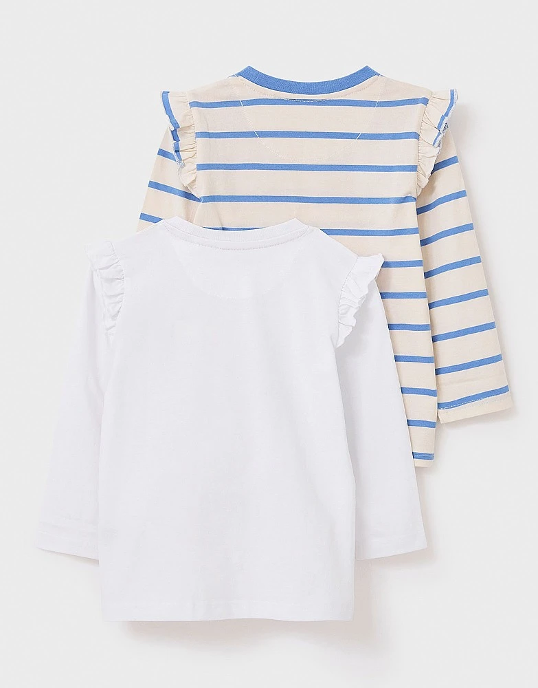 A two-pack of long sleeve tops, one in white and one in colourful stripes. These super cute tops feature paw-fect dog prints and frilly detailing on the sleeves. These will be her wardrobe’s new best friends, just pair with jeans or leggings – wag-tastic!