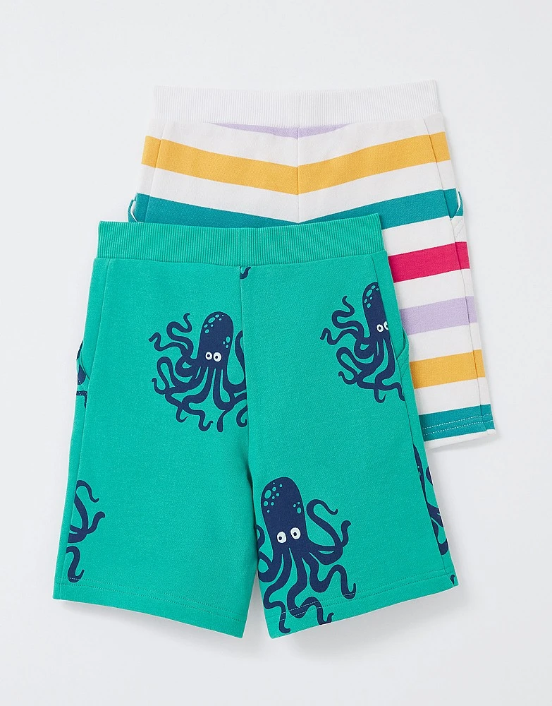 A two-pack short set. This fun set features a green octopus print pair and colourful stripe pair, both with drawstring waistbands and side pockets. They make the perfect pairing to tees and sandals on warmer days.