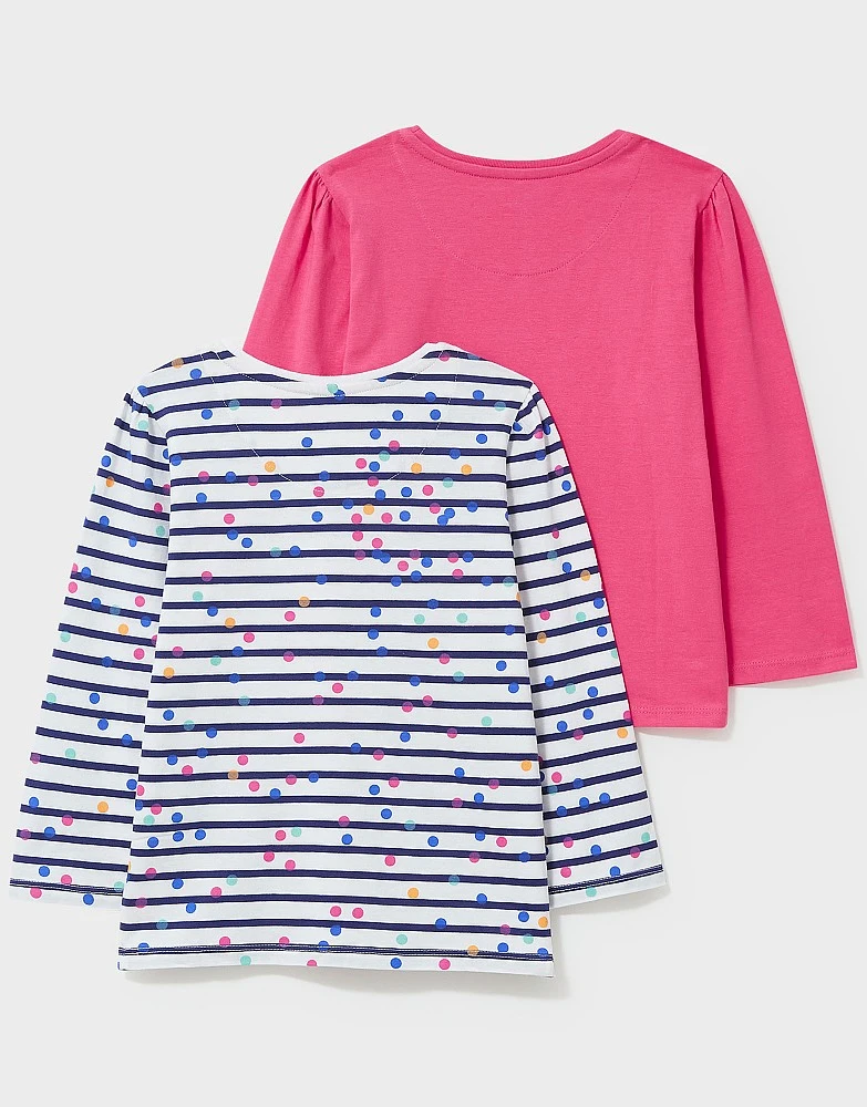A pair of puff sleeve tops: one in raspberry pink and the other in our classic navy and white stripes with a confetti of polka dots decorating the front. Super cute with jeans.