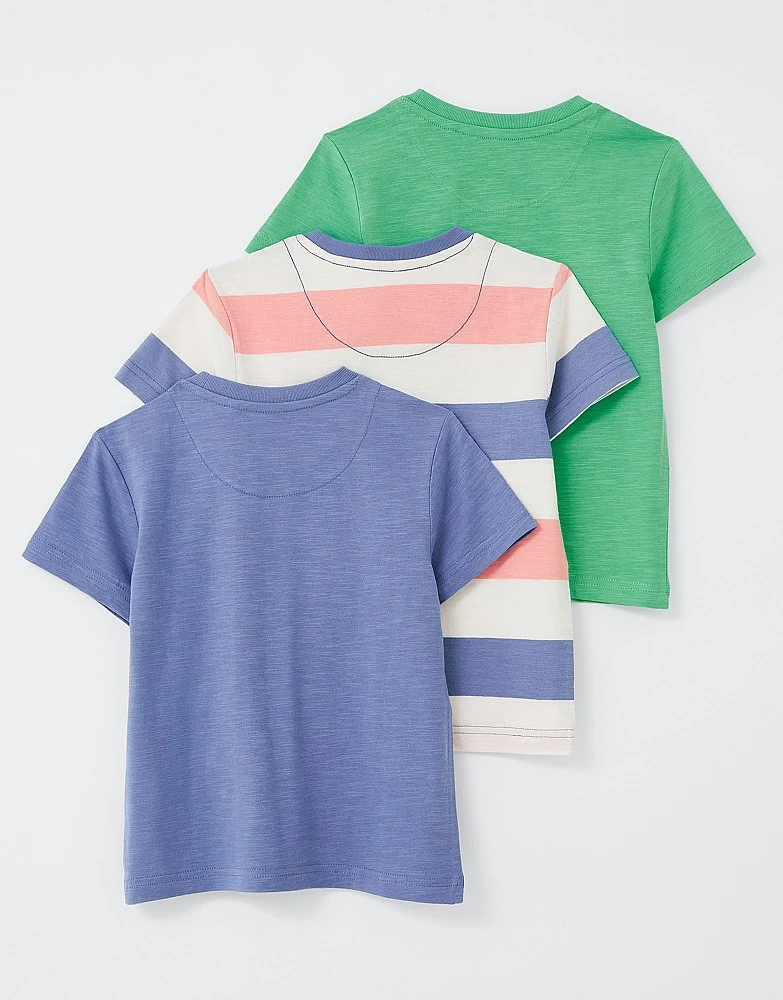 A three-pack of t-shirts in blue, coral and green. A mix of plain and stripe designs, there’s something for any mood. Made from soft cotton, they’re comfy and perfect for delicate skin.