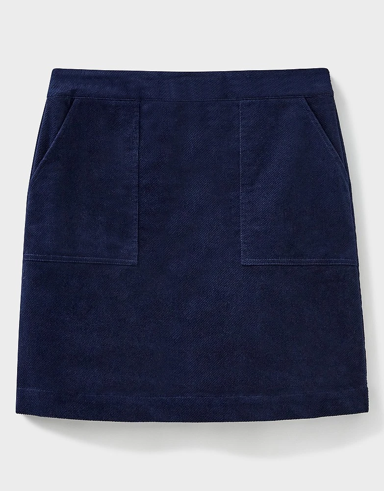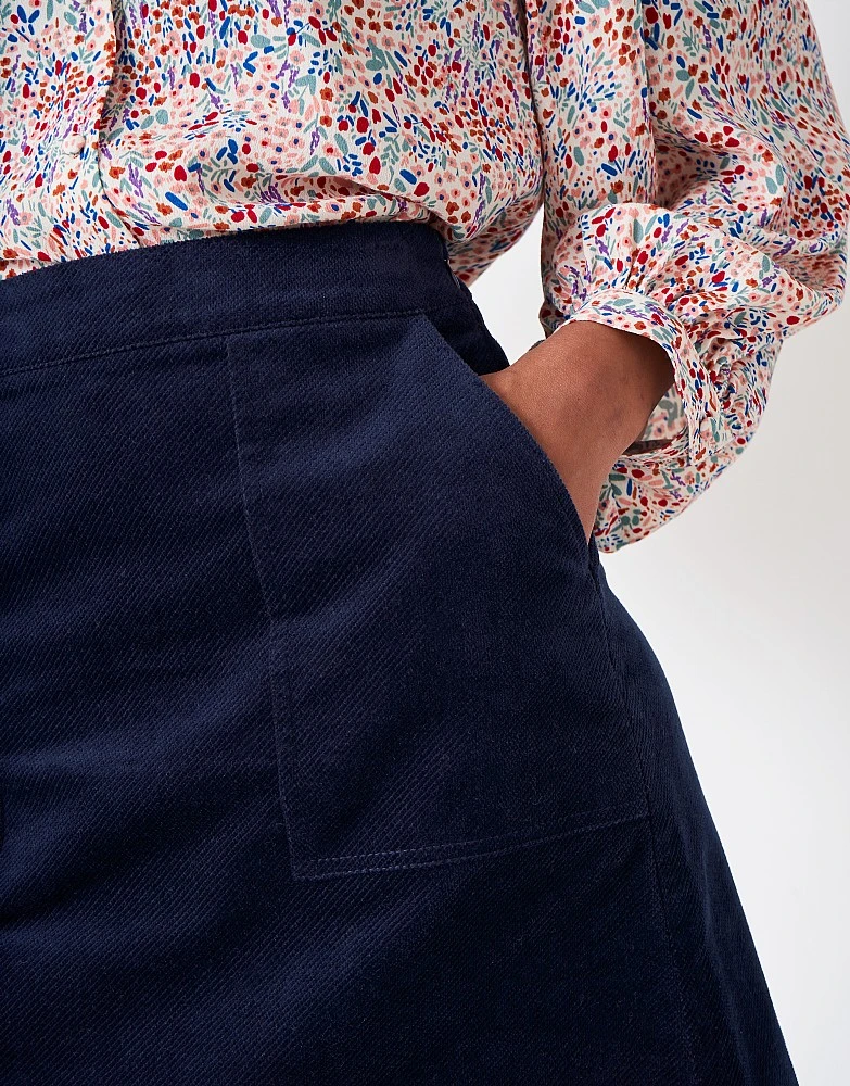 An a-line cord skirt in dark navy. Cut from supersoft cotton corduroy with two front pockets, we love it with a Breton, blouse or a roll neck jumper. Just the thing to see you from autumn to winter.