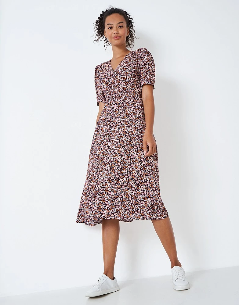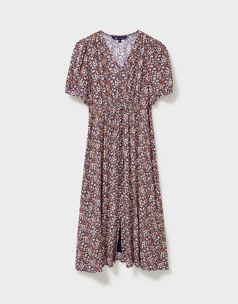 The Anais dress in navy, orange and pink. Designed with a house-drawn floral print, this detail-driven dress has button cuffs and a tiered hem. It’s versatile too – we love it with trainers or boots. Stylish and oh-so-swishable.
