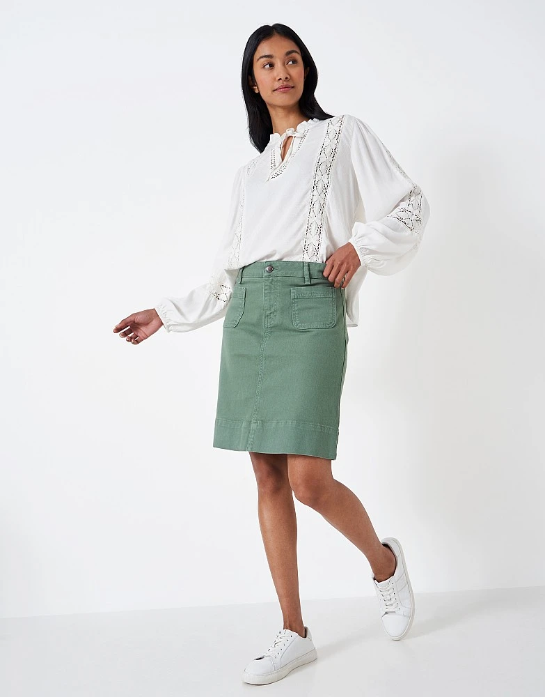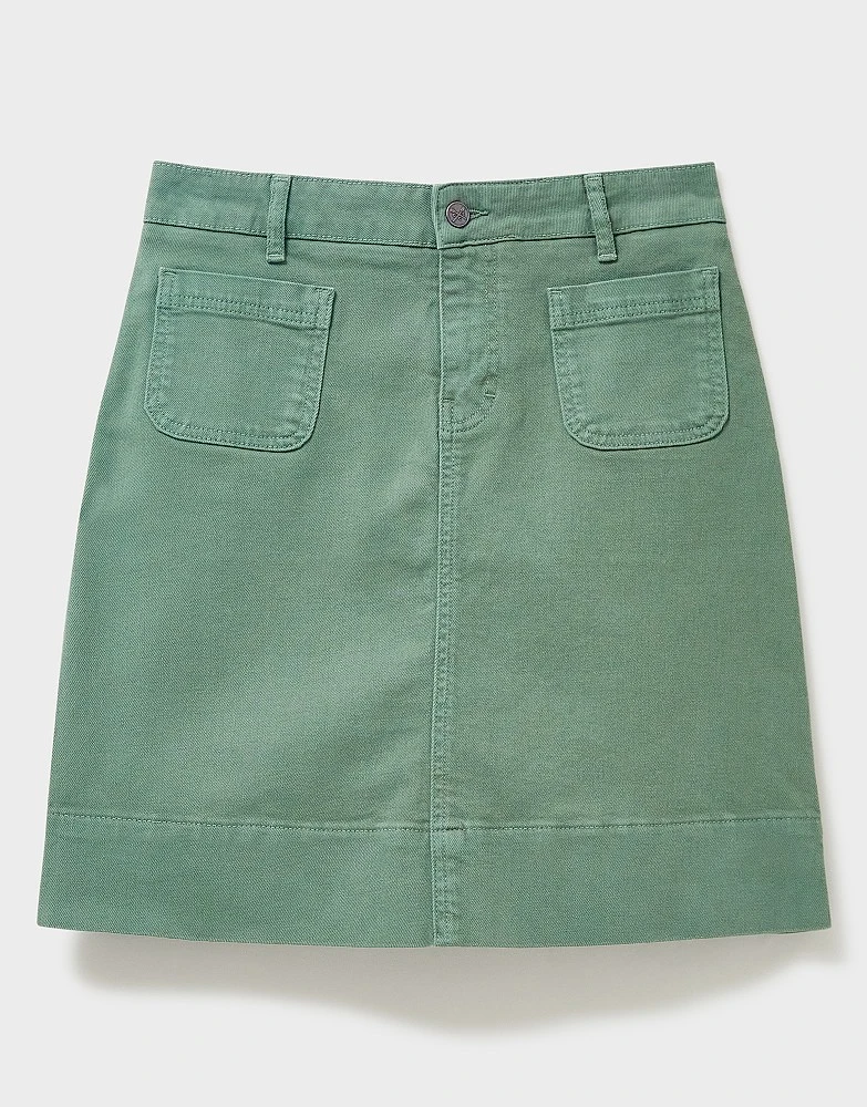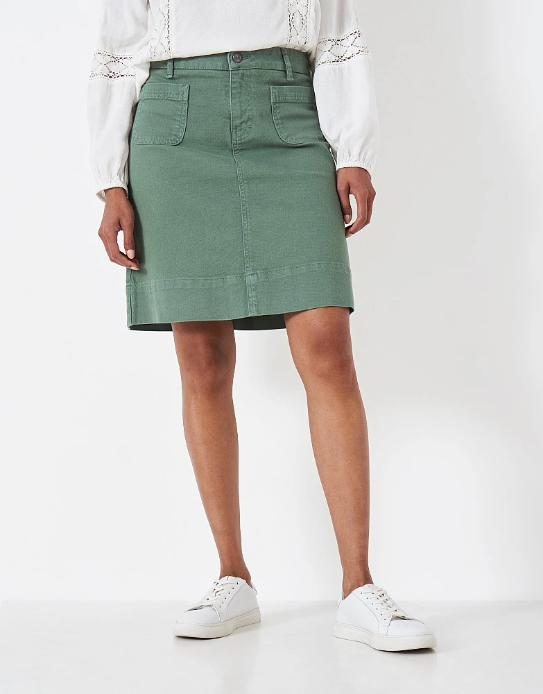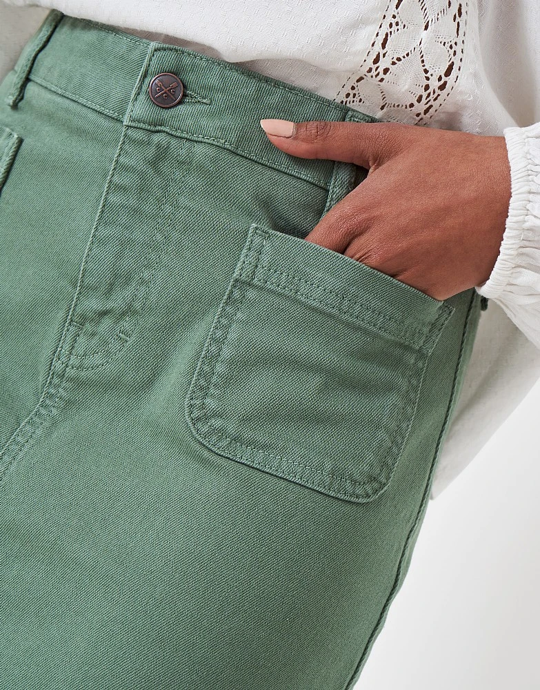 Say hello to our Analee twill skirt in khaki. Featuring double pockets, accent stitching and our embroidered crossed oars . Tuck in your favourite blouse and spring into summer in effortless style.