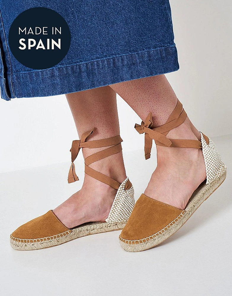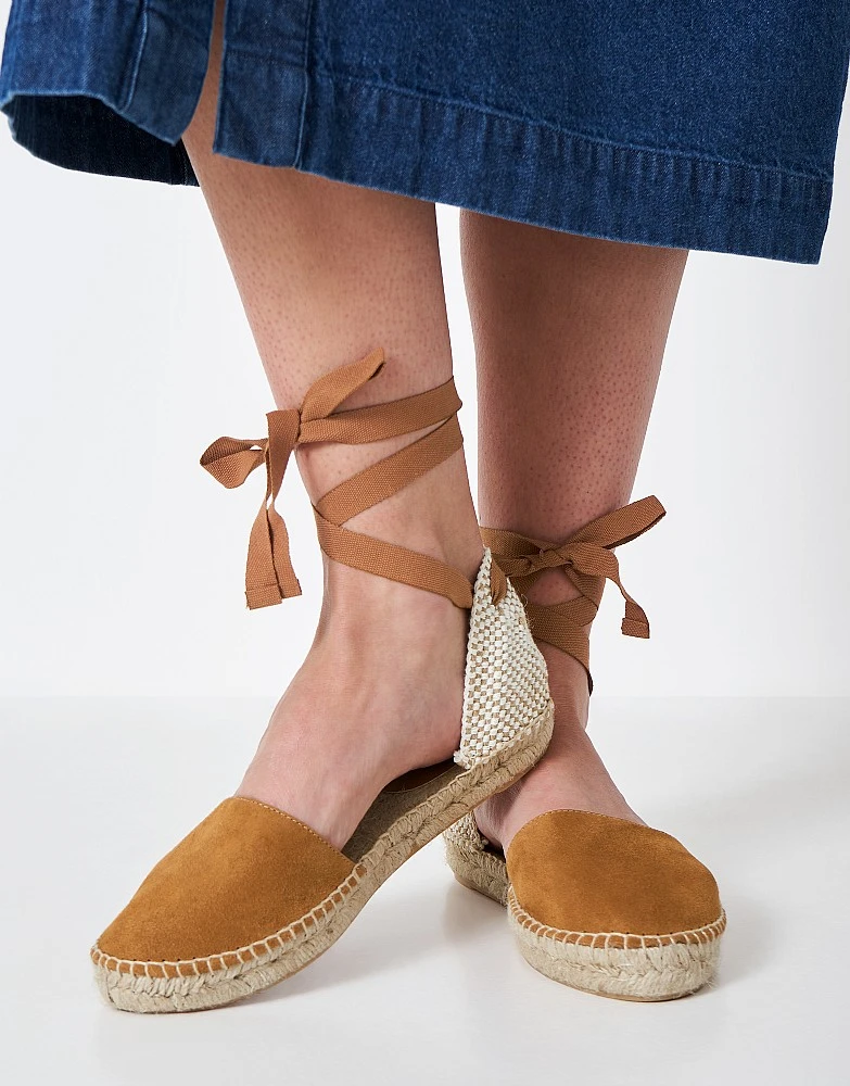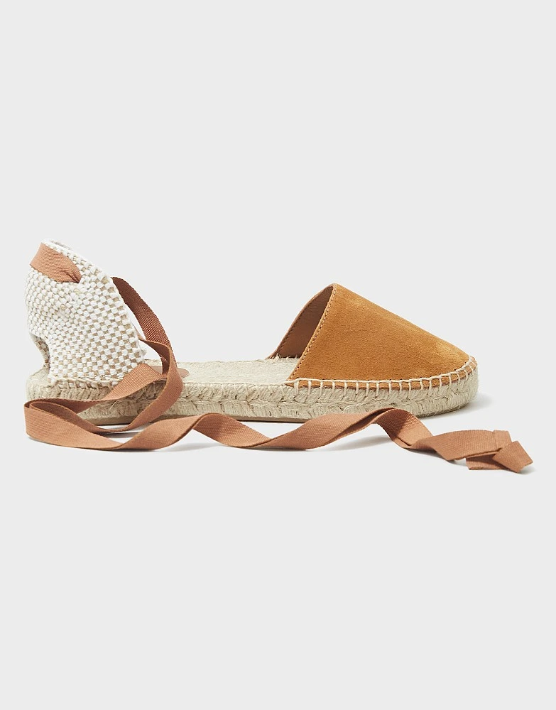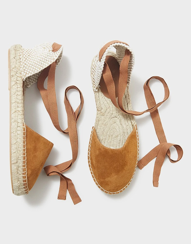 Tan suede espadrilles. Effortlessly feminine, the ribbon tie is the perfect finishing touch to these summer essentials. Pair with shorts for a laidback look or slip on a midi skirt for a more polished ensemble. Simply stylish.