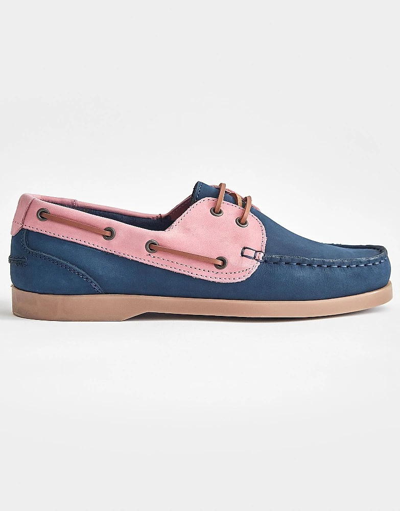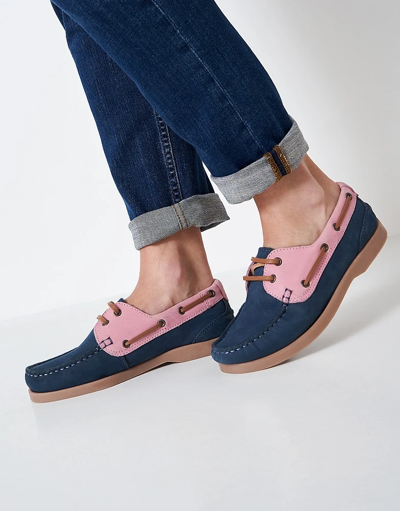 Our Aubry deck shoes in navy and pink. These feature accent stitching, brown laces and a stylish colour palette. Pair with everything from rosy pink skirts to comfortable navy jeans.