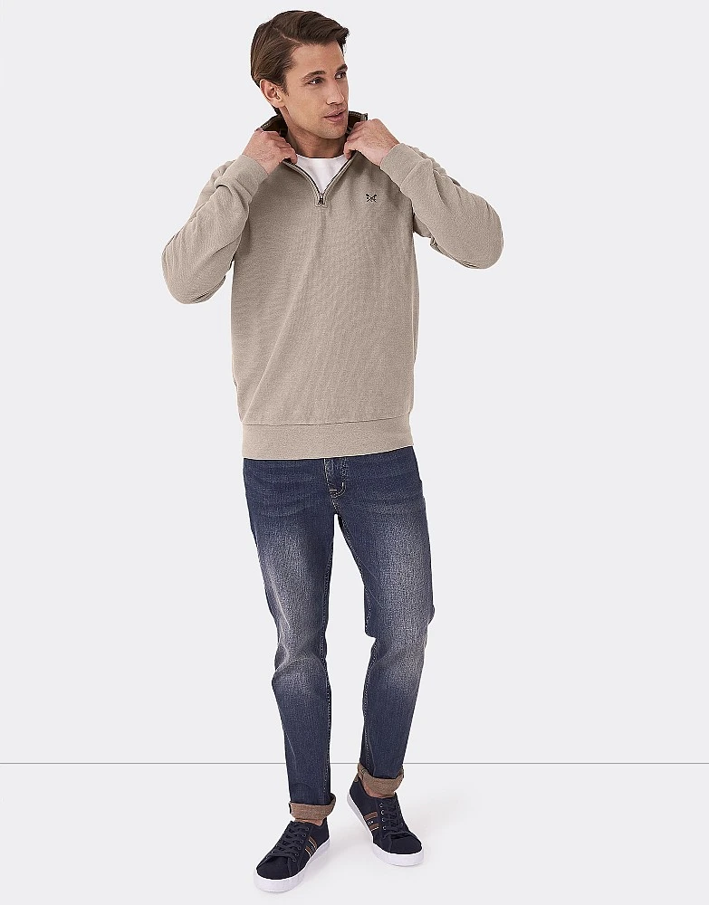 Our birdseye Oxford half zip sweatshirt in taupe. A cosy layer that will partner with just about anything in your wardrobe, this has a woven dobby pattern, a supersoft ribbed collar with contrast trim detailing and a branded zip pull. Walk into the weekend in comfort, teamed with jeans and trainers.