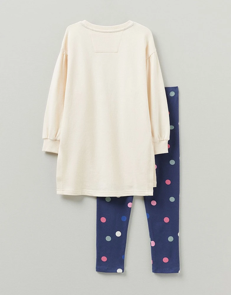 A long sleeve tunic and leggings set. The blouson sleeve tunic is very grown-up while the spotty leggings are as comfy as they come. Two in one.