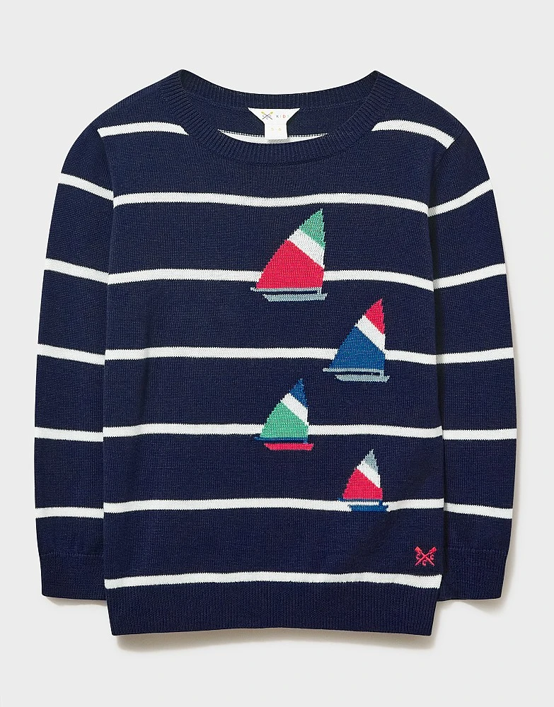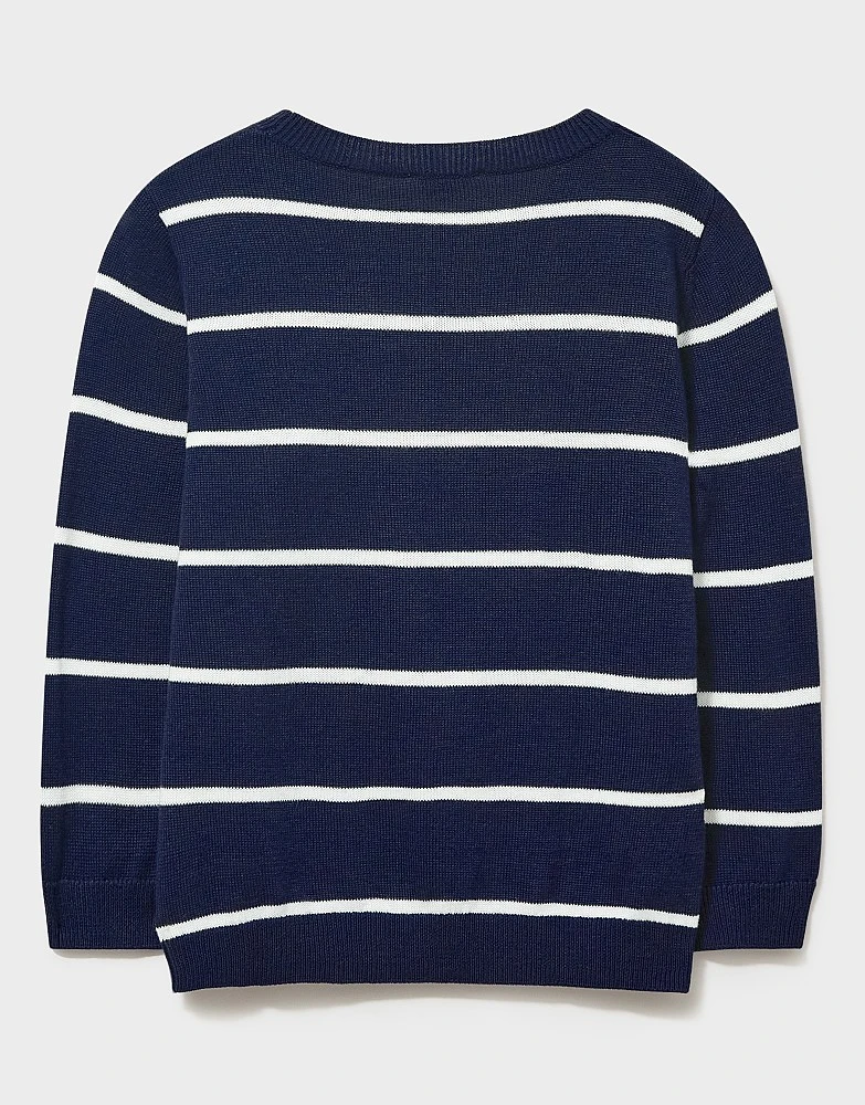 A navy blue and white striped crew neck jumper. Set sail with this cosy knit, which features a nautical boat design and ribbed cuffs. Our crossed oars are neatly embroidered on the hem in a contrasting stitch. It looks ultra-cute paired with chinos.