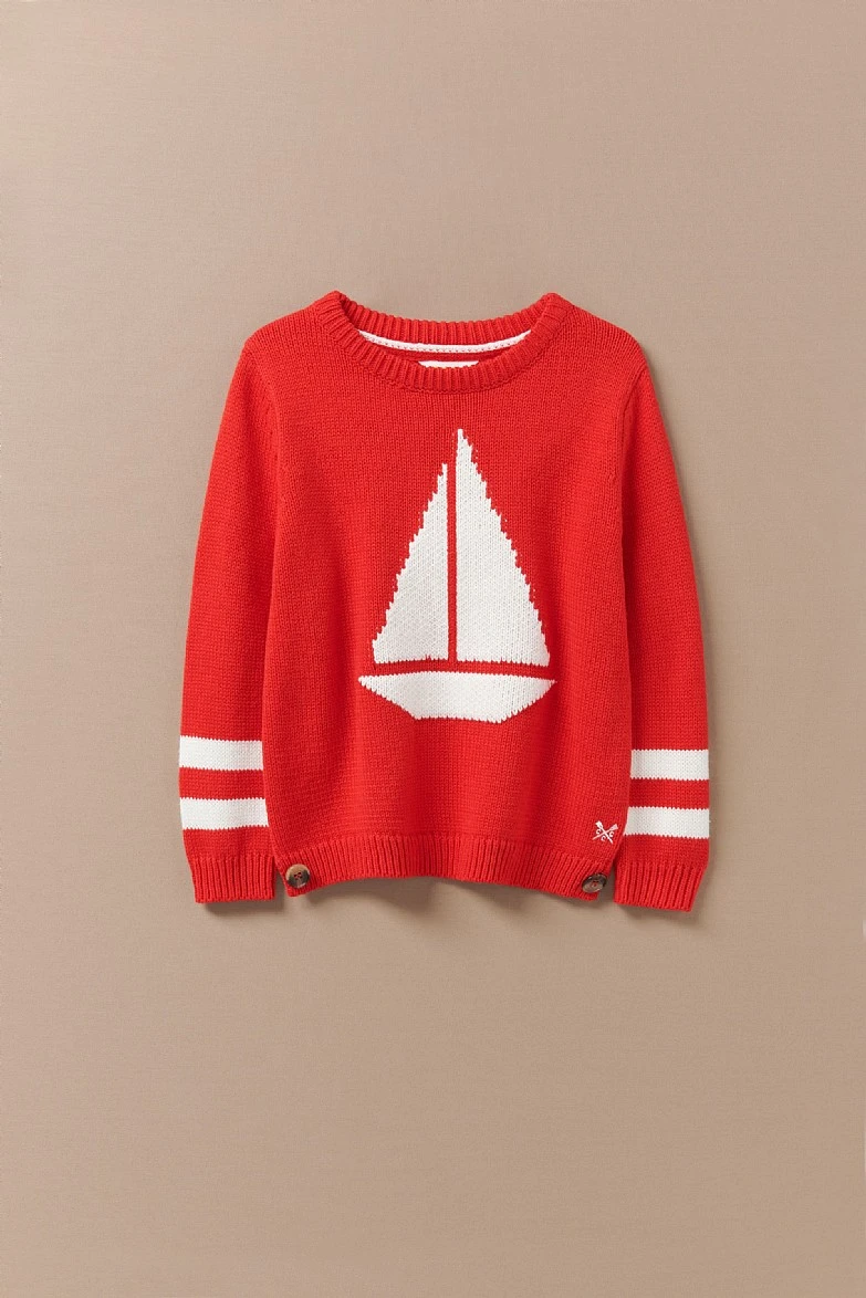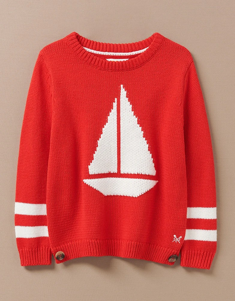 A red and white jumper. Featuring a sailing boat on the front and wide stripes on the sleeves and back, this number has a real coastal feel. It’s perfect for a day by the sea – or playtimes in a sea of toys.
