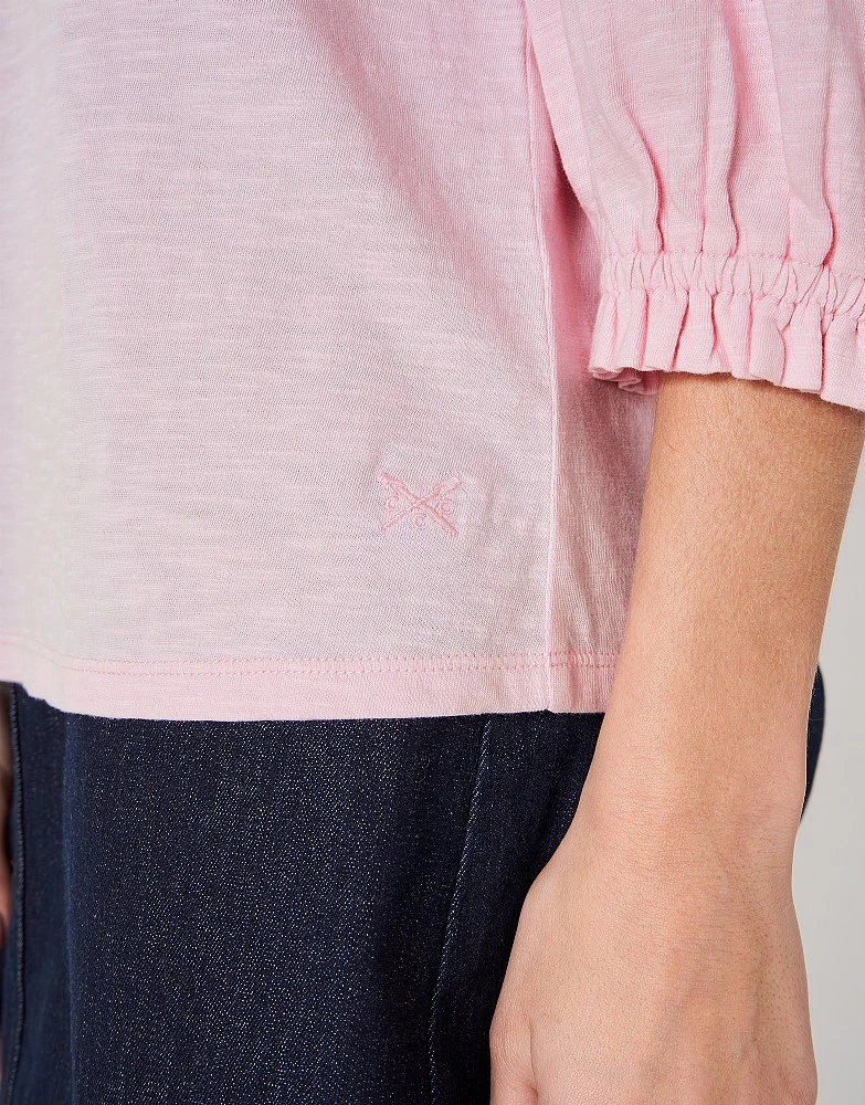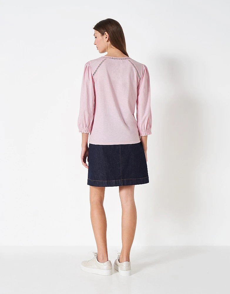 Introducing our broderie yolk 3/4 length sleeve top in pink. We’re in love with the pretty laced details and cuffed sleeves, lending to the elegant feel of this top. Simply pair with denim and you’re good to go.