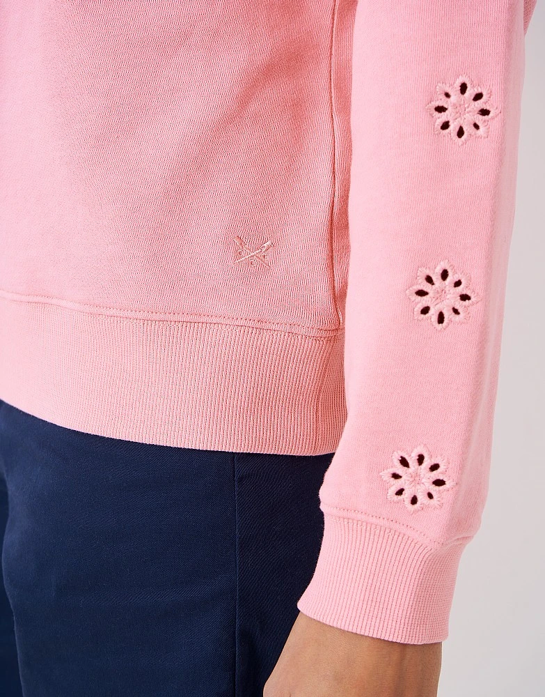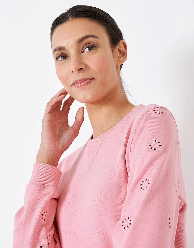 Comfy meets cute with our Broderie Sweatshirt in pink. The broderie detailing along the sleeves elevates this wardrobe staple, and the crossed oars embroidered on the hem is the perfect finishing touch. Pair with jeans and leather trainers for a laidback look that still feels polished.