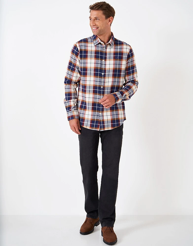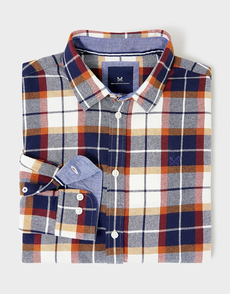 A checked shirt in navy, blue, orange and white. Crafted from supersoft brushed cotton, this stylish shirt has chambray touches around the neck and cuffs. Wear with jeans and boots for a classic autumn look.