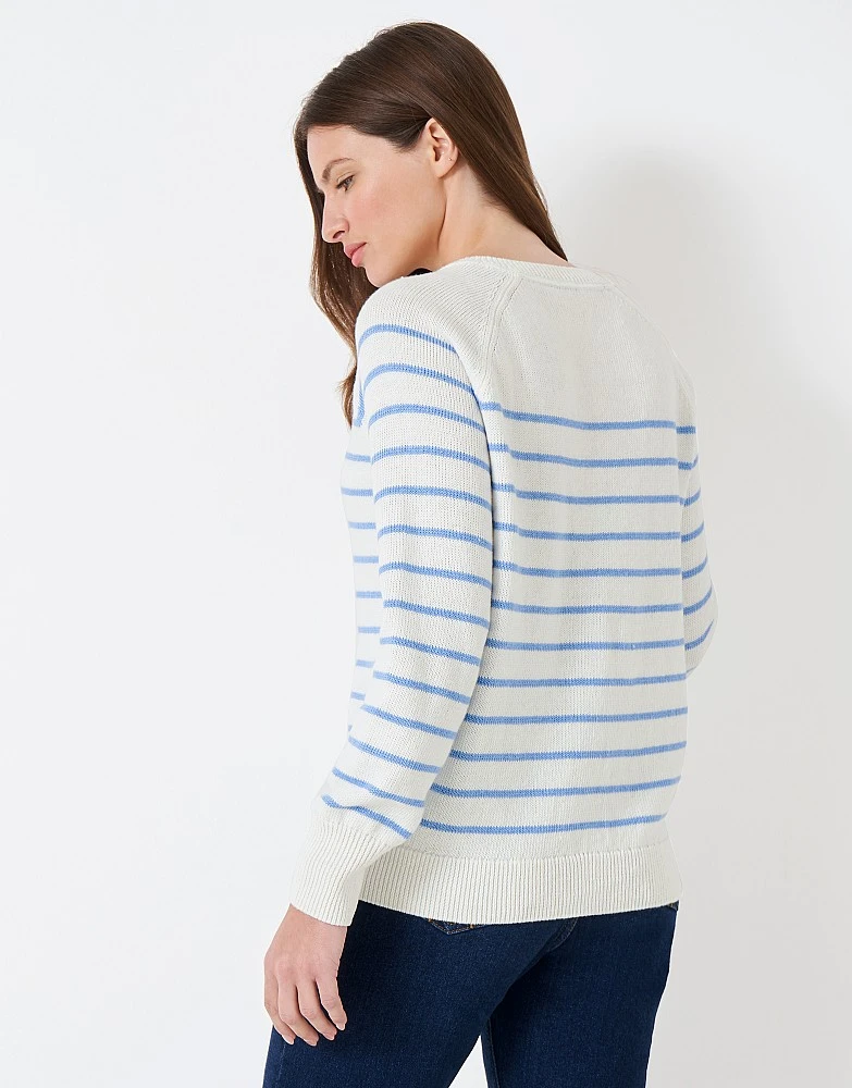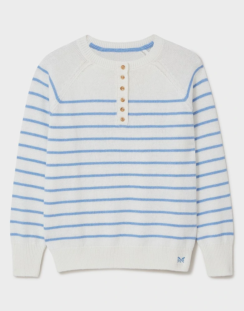 Introducing our Henley striped knit in off-white with blue stripes. The button-down placket is the star of the show, with scallop edging adding a feminine flair. Plus, spot our crossed oars neatly embroidered on the hem – the perfect finishing touch. Just add jeans.
