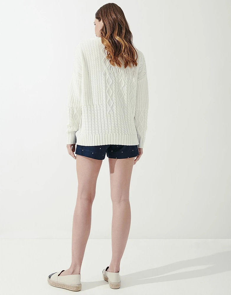 Our Camber cable jumper in cream. Inspired by the British coast, this knit features the interlocking cable design you know and love in a new cotton blend for summer. Throw on over shorts and jeans when the sun goes in.