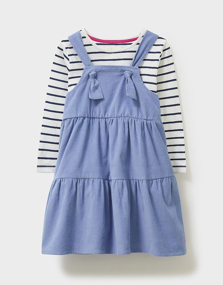 A corduroy pinafore and Breton set. The perfect go-to outfit for her little adventures, this two-piece features a pretty tiered dress in cornflower blue with tie-up shoulder straps. Our classic long sleeve Breton is the ideal pairing to layer underneath – we’ve got a feeling she’ll be reaching for this look a lot.
