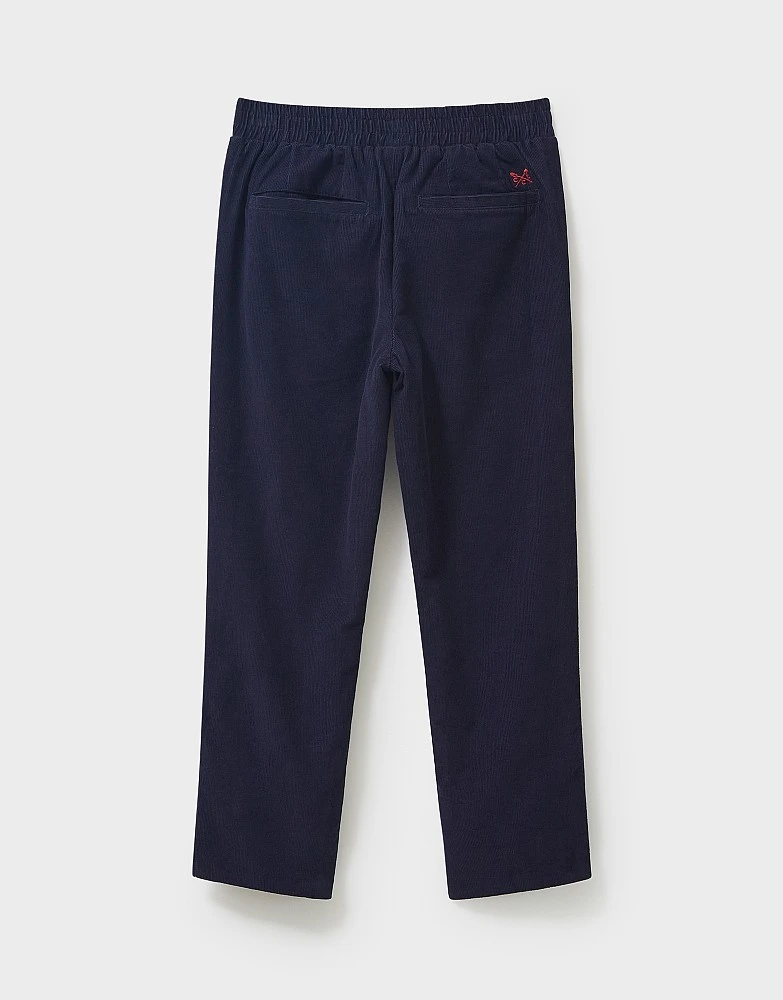 A pair of corduroy joggers in navy blue. This style features an elasticated drawstring waist, handy side pockets and they’re finished with our embroidered crossed oars in contrast stitching on the reverse. We like them best when worn with a cosy sweatshirt and trainers – for ultimate comfort, of course.