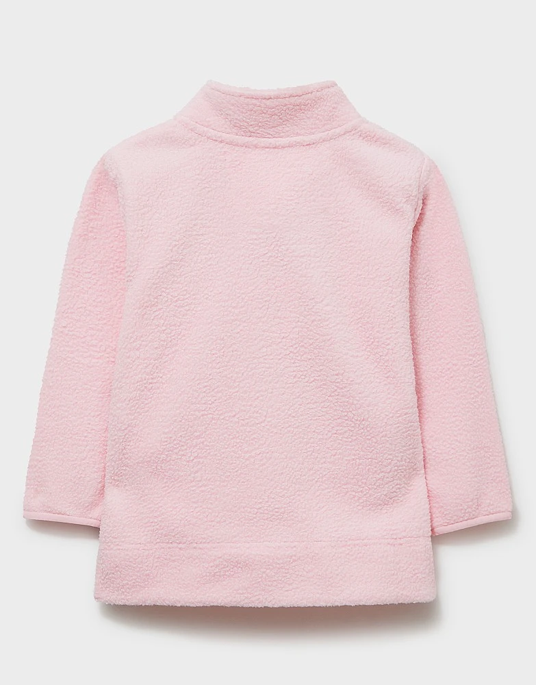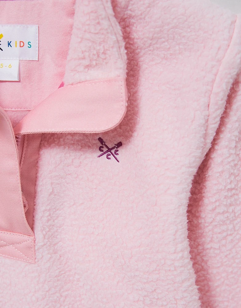 A half zip fleece in pink. Top of the cosy list? This cuddly fleece is complete with kangaroo pockets and our crossed ours in contrasting stitching embroidered on the chest. Use it to partner with a jacket or wear as the top layer.