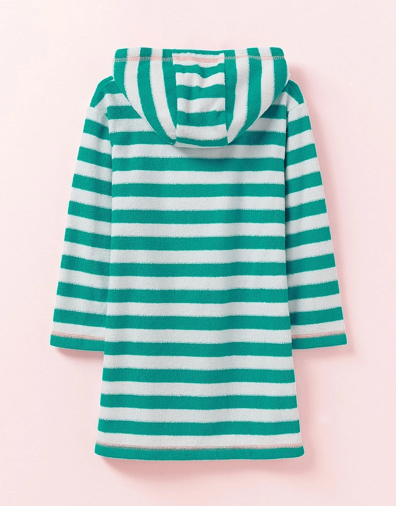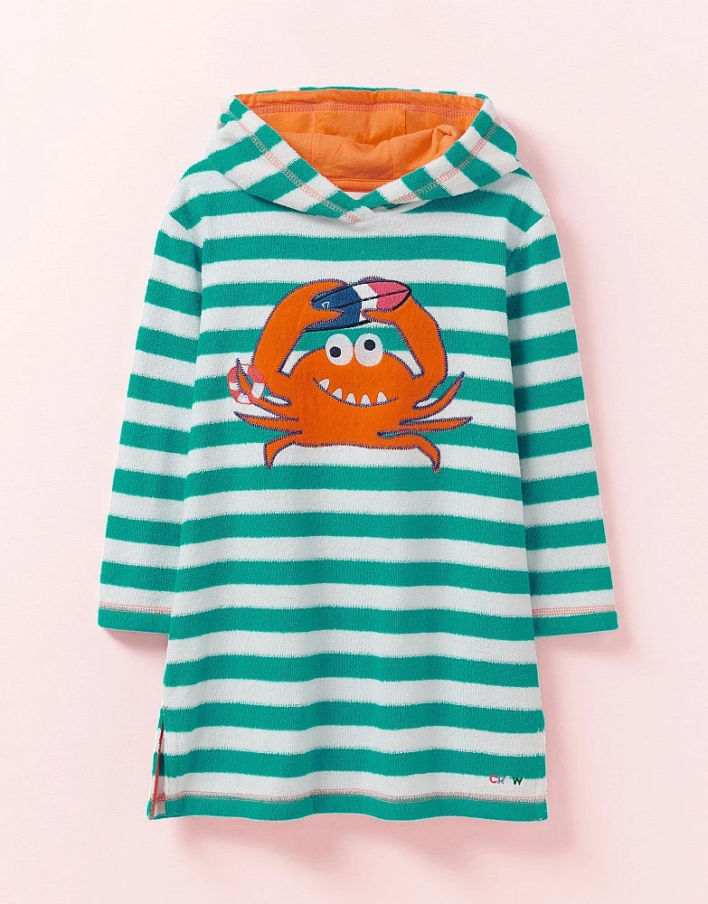 Keep post-dip chills at bay with our cosy towelling cover up in white and green. Detailed with a googly-eyed crab and our embroidery on the hem, it’s perfect for drying off in style. Just add flip flops and they’re ready for a beach adventure.
