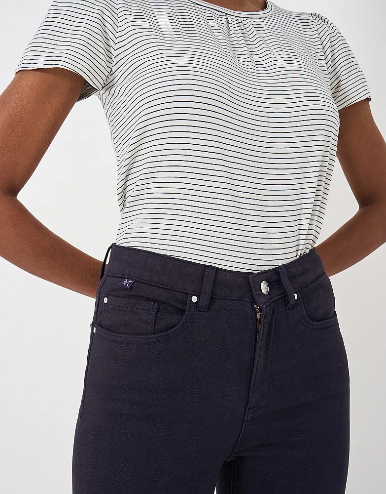 Our bestselling crop in classic heritage navy. In stretch denim with branded buttons and our crossed oars embossed on the coin pocket. Add a comfortable tee and you’re ready to go.The perfect in-between jean.