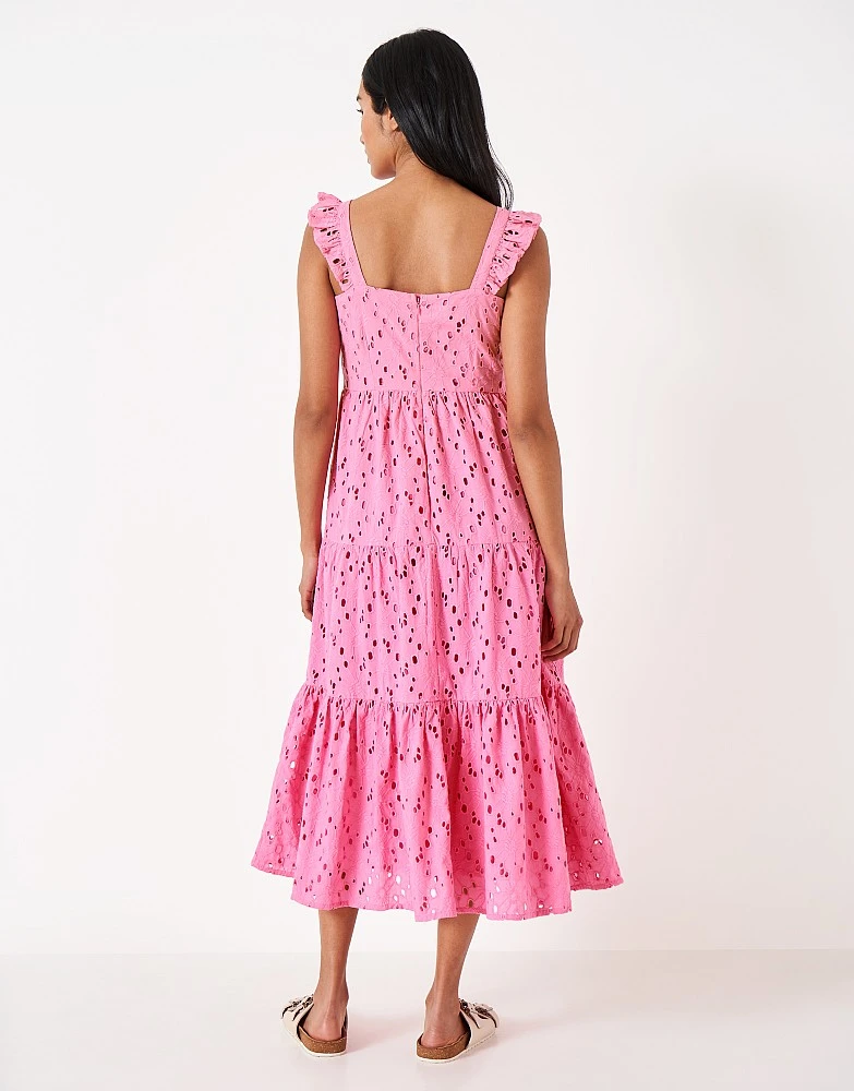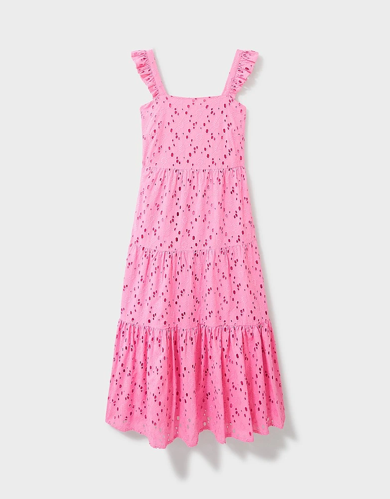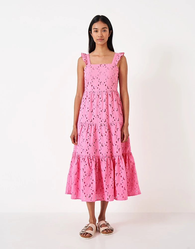 Meet Dana, our tiered summer dress in pink. We’re obsessed with the broderie detailing, frilled strappy sleeves and midi length – it has sunshine written all over it. Pair with sandals and straw accessories and we’ll meet you at the cabana…