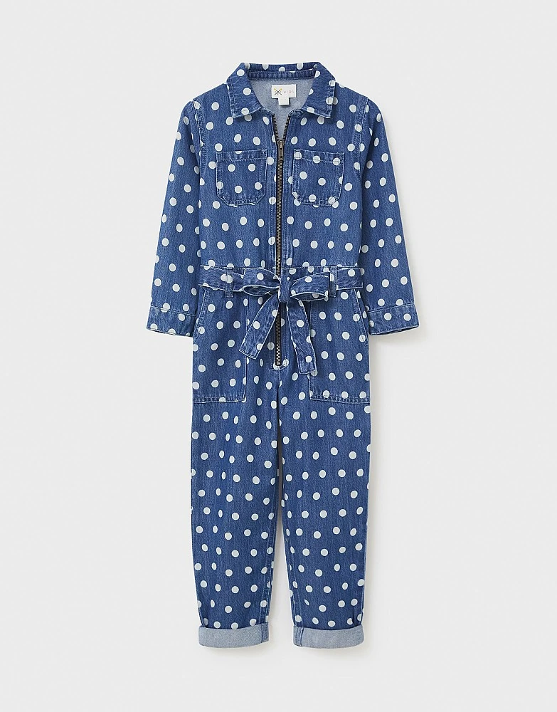 A blue denim spot boilersuit. This comfortable piece features a cute spotted print with a stylish tie-waist. Watch little eyes light up at the handy pockets (perfect for their creative missions).