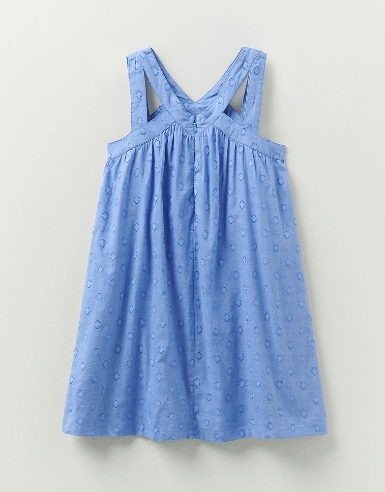 A cornflower blue sundress. The dobby fabric gives a summery pattern while the shape is floaty and perfect for warm days. Just add a sunhat and sandals.