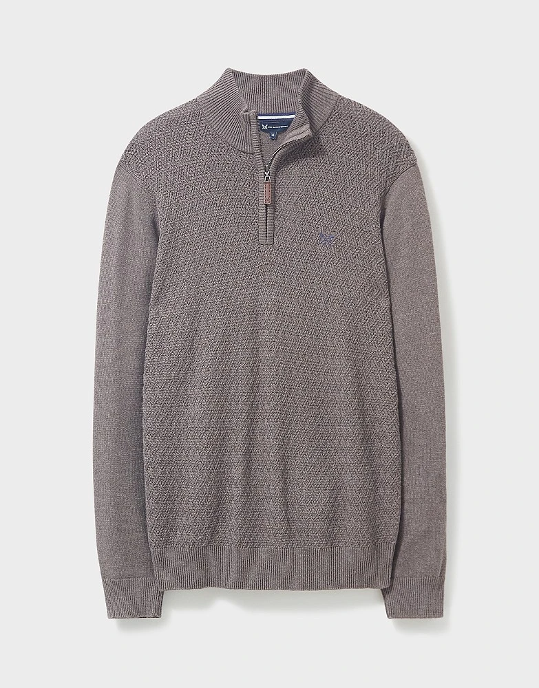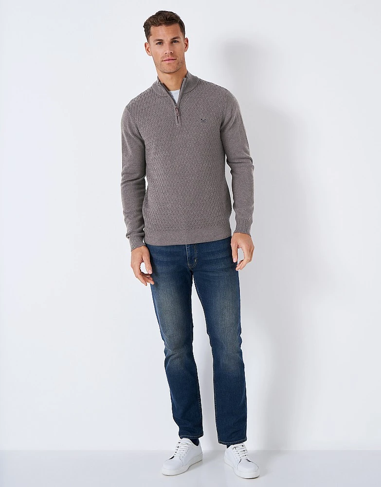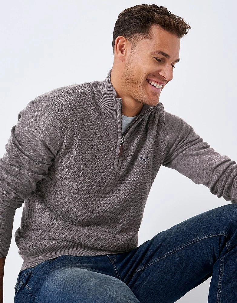 A half zip knit in taupe. In a muted hue with a textured stitch, this jumper is smart and sophisticated. We particularly like it paired with a denim shirt and dark jeans. Timeless.