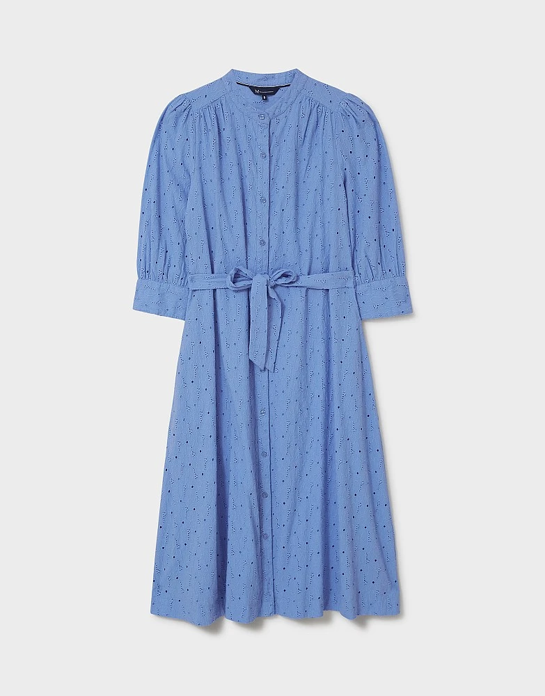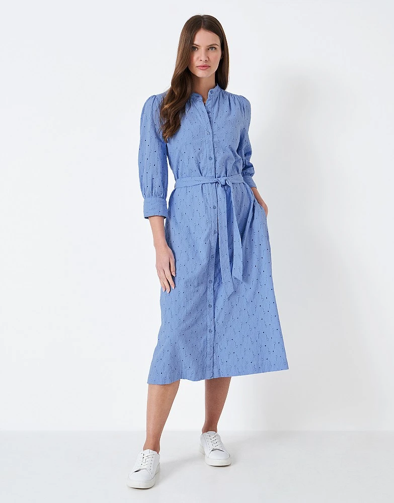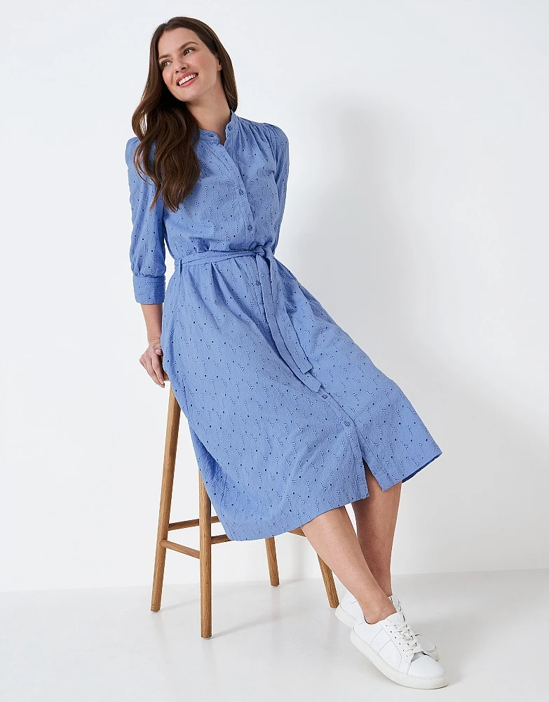 Our Edith dress in cornflower blue. Made from pretty broderie fabric, this button-up style cinches in at the waist with the matching tie belt, lending itself to a full, feminine skirt. Other features such as the ¾ length sleeves and pintuck details on the shoulders make this dress even more desirable. Pair with heeled espadrilles.