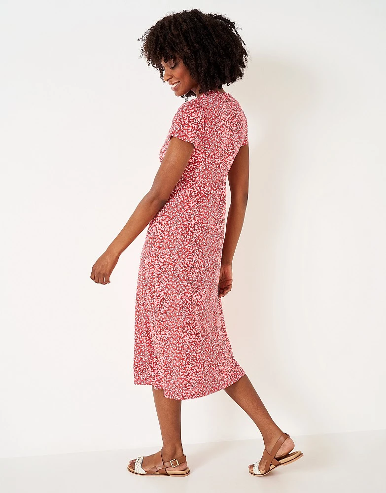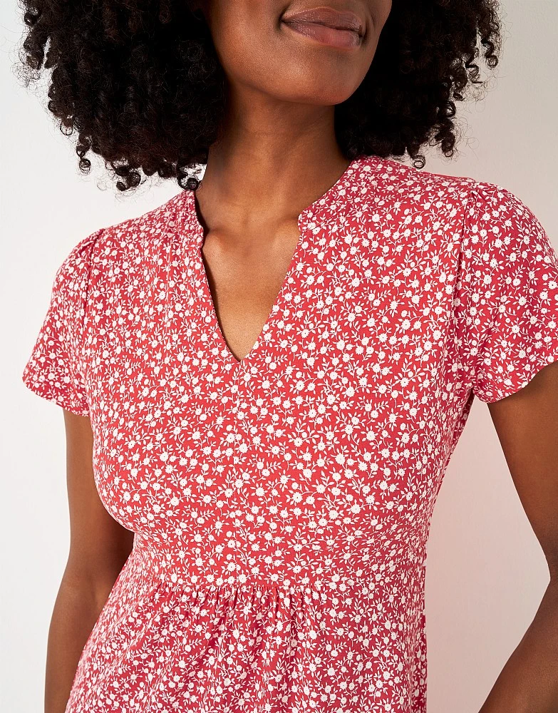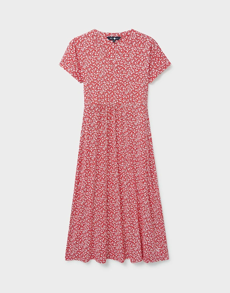 A short sleeve jersey dress in red. The flutter sleeves and the pretty skirt give this flowy appeal, and we love the pretty all-over floral print. Accessorize with a necklace and white trainers – perfection.