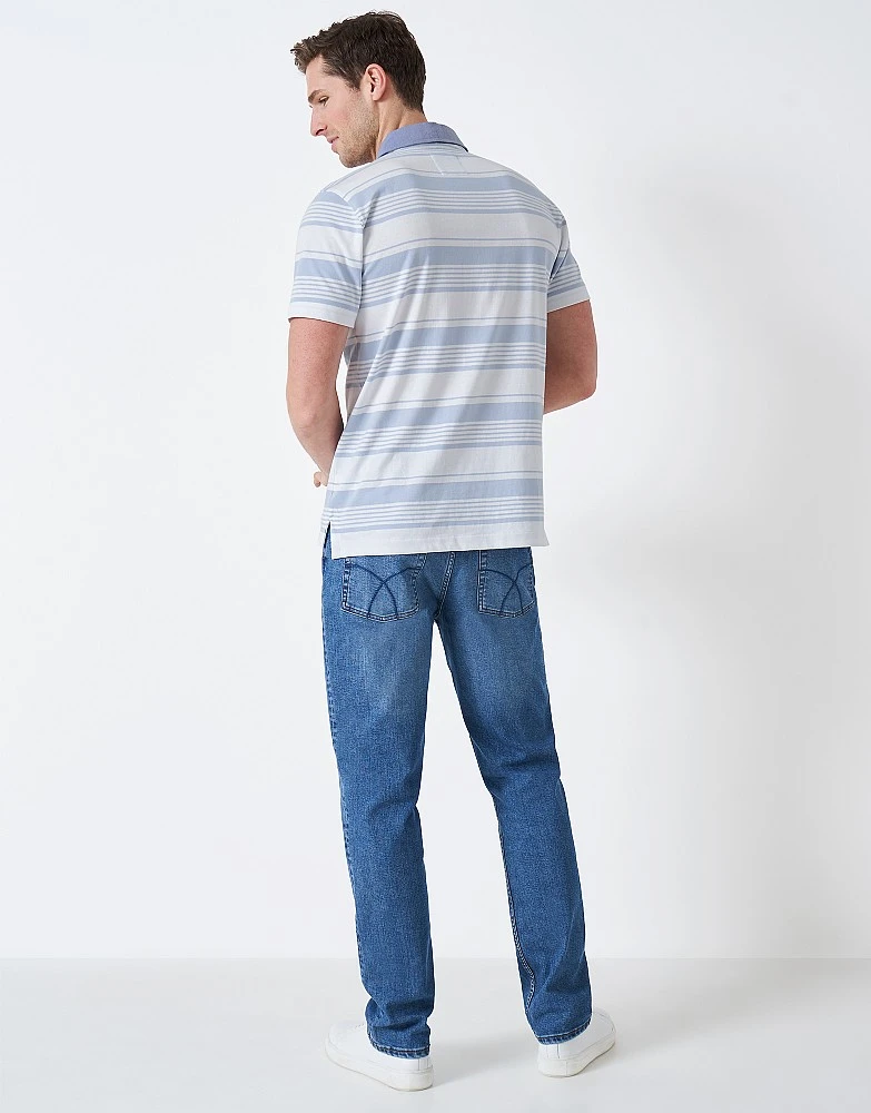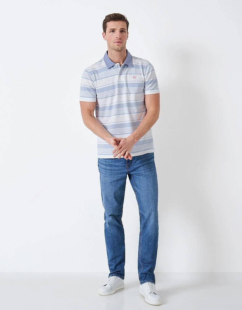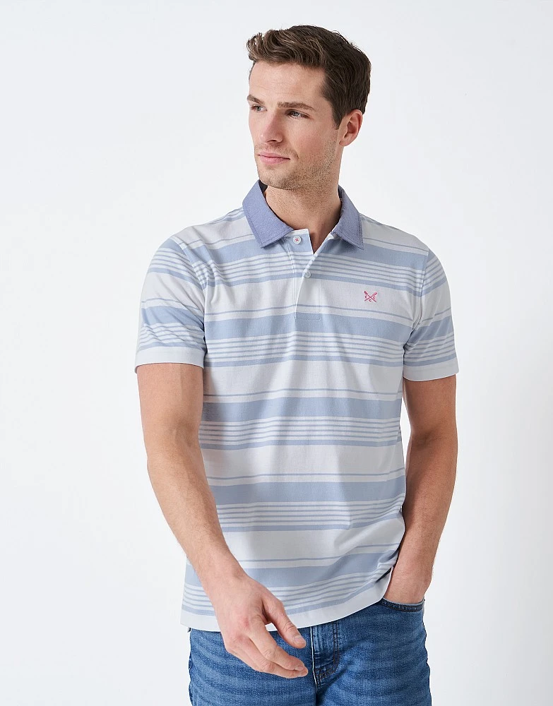 Our Epsom striped polo. A wardrobe classic designed with pale blue and white stripes with a contrasting collar. Featuring all our signature Crew details, it’s a top destined for your casual wardrobe.