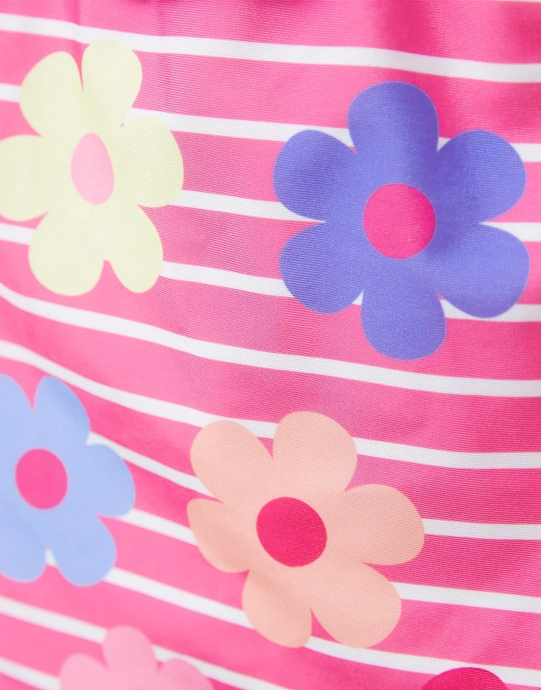 A tankini with a floral stripe print. You can’t help but feel in the summer mood with this two-piece in a fun and bright pattern. We love the frilly collar and waistband detailing. Just add flip flops.