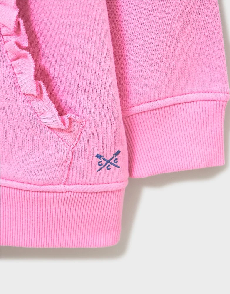 A zip through hoodie in pink. A smattering of florals and a stylish striped hood is all that’s needed to make this super special. We’ve added ruffles on the front pockets for that perfect finishing touch. Wear over a Breton for easy spring-to-summer styling.