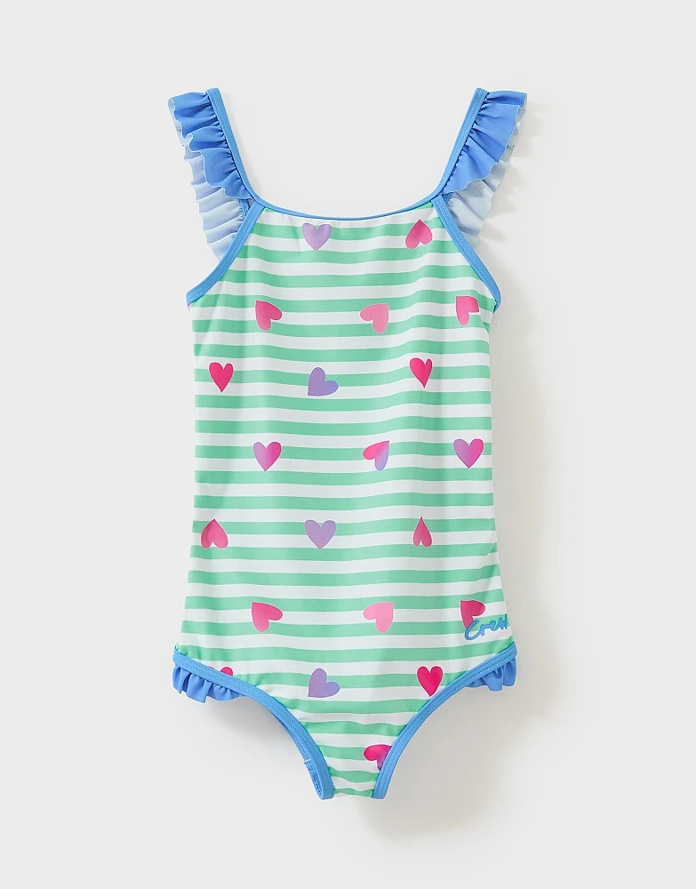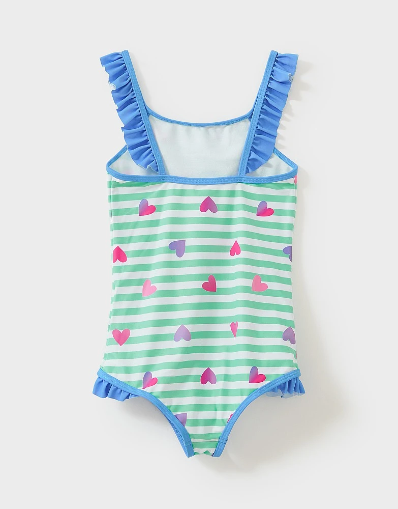 A mint stripe swimsuit with hearts. Little ones will love the pretty frills and pattern on this. It’s perfect for everything from paddling pools to proper pools.