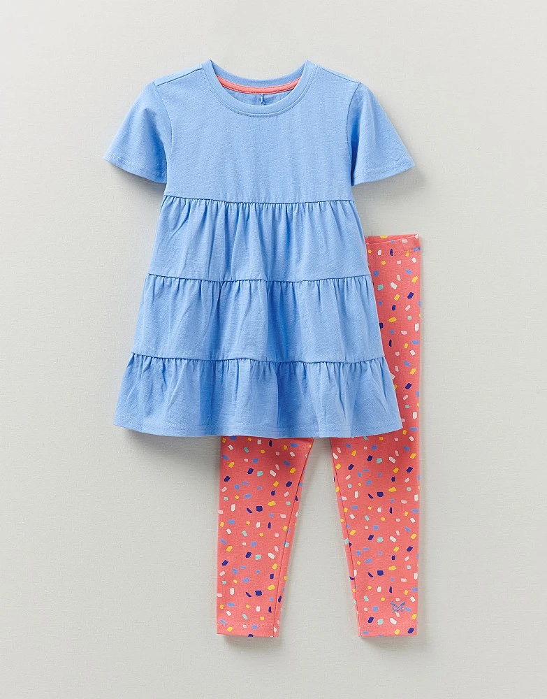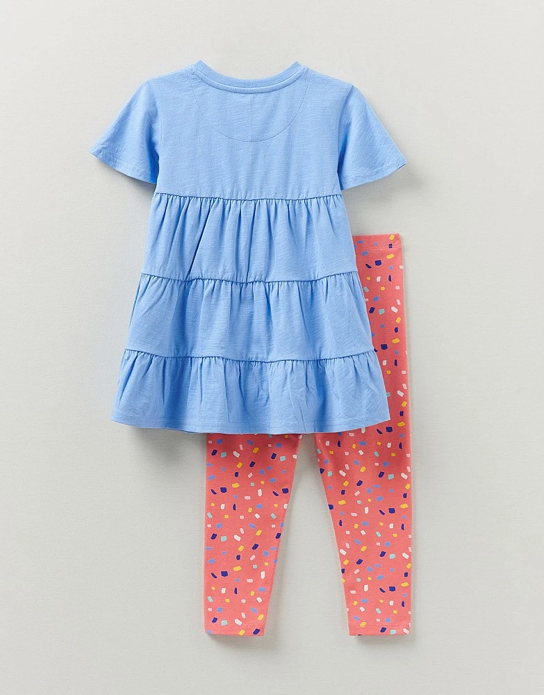 A tiered tunic and printed leggings set. The fluttery sleeves and gathers give this top are very a pretty shape, and the all-over print on the leggings is equally cute. Perfect for playtimes and adventures.