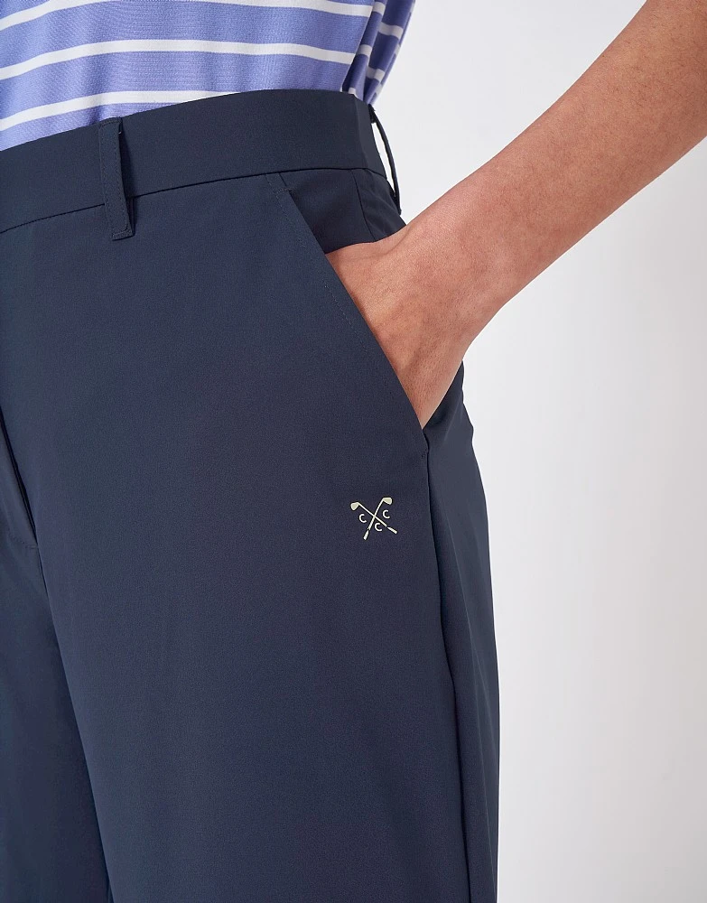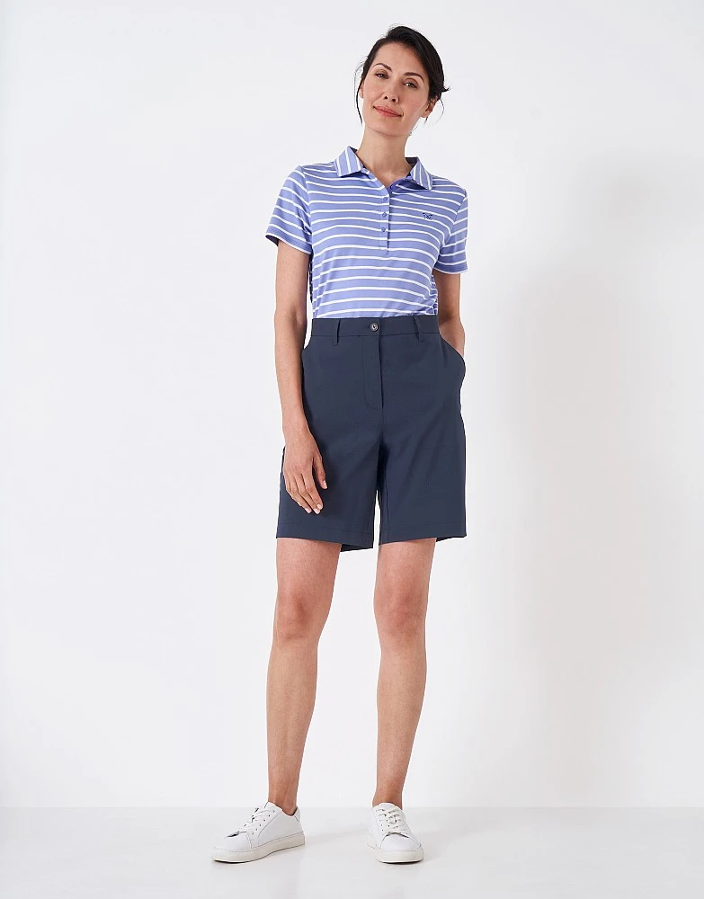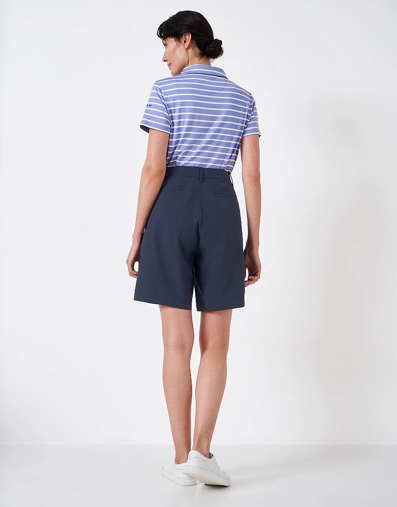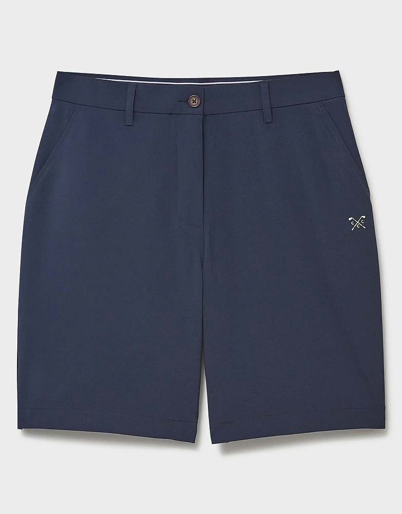 Our golf shorts in navy. When the weather calls for bare legs, look no further than these for trips around the fairway. They’ve been made with a touch of stretch for all-day comfort, and our Crew touches such as crossed clubs printed below the pocket complete the design. Tuck in our sleeveless golf polo and away you go.