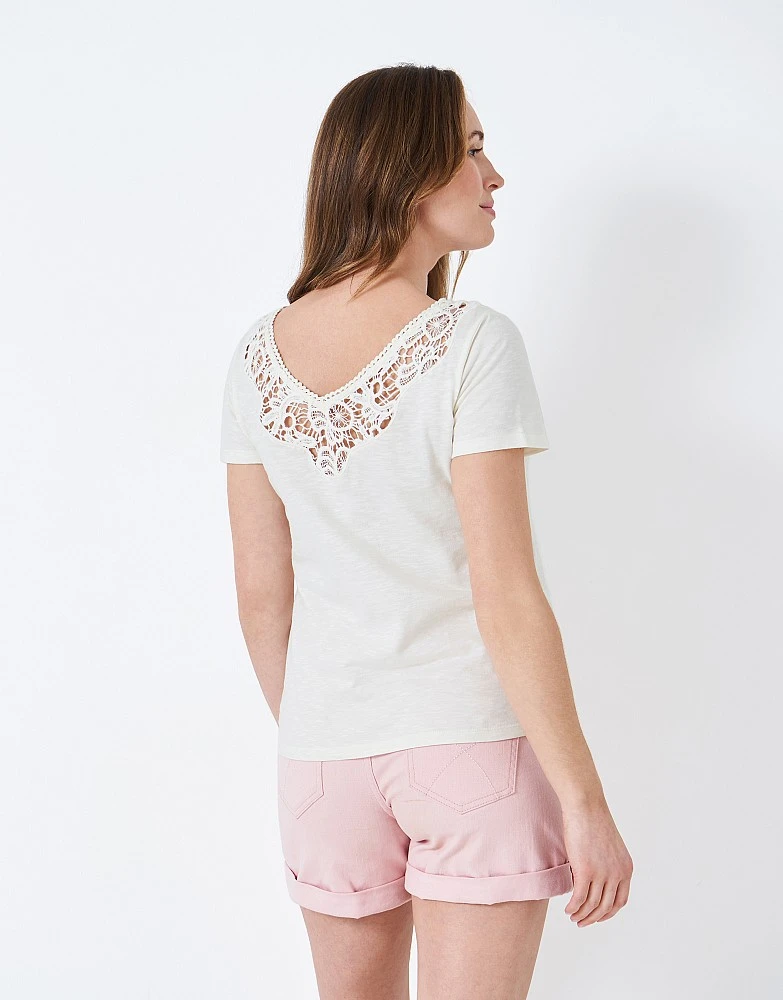 “Our Iona top in white. We love the simplicity of this tee, which features a round neckline and a lace detailed placket, adding an extra feminine touch to a staple style. Made from relaxed cotton slub, it’s perfect for wearing with jeans on days off.