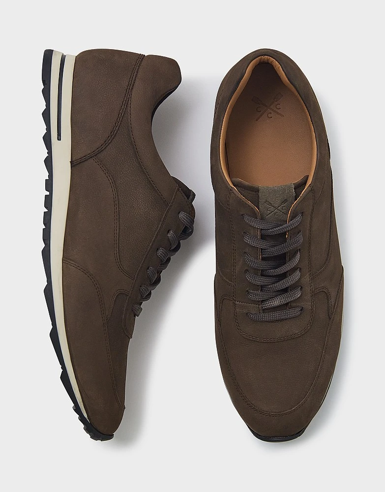 Our James leather runner trainers in chocolate. The mixed materials give these texture and we love the athletic shape. We’ve designed them without eyelets for a smarter, smoother look.