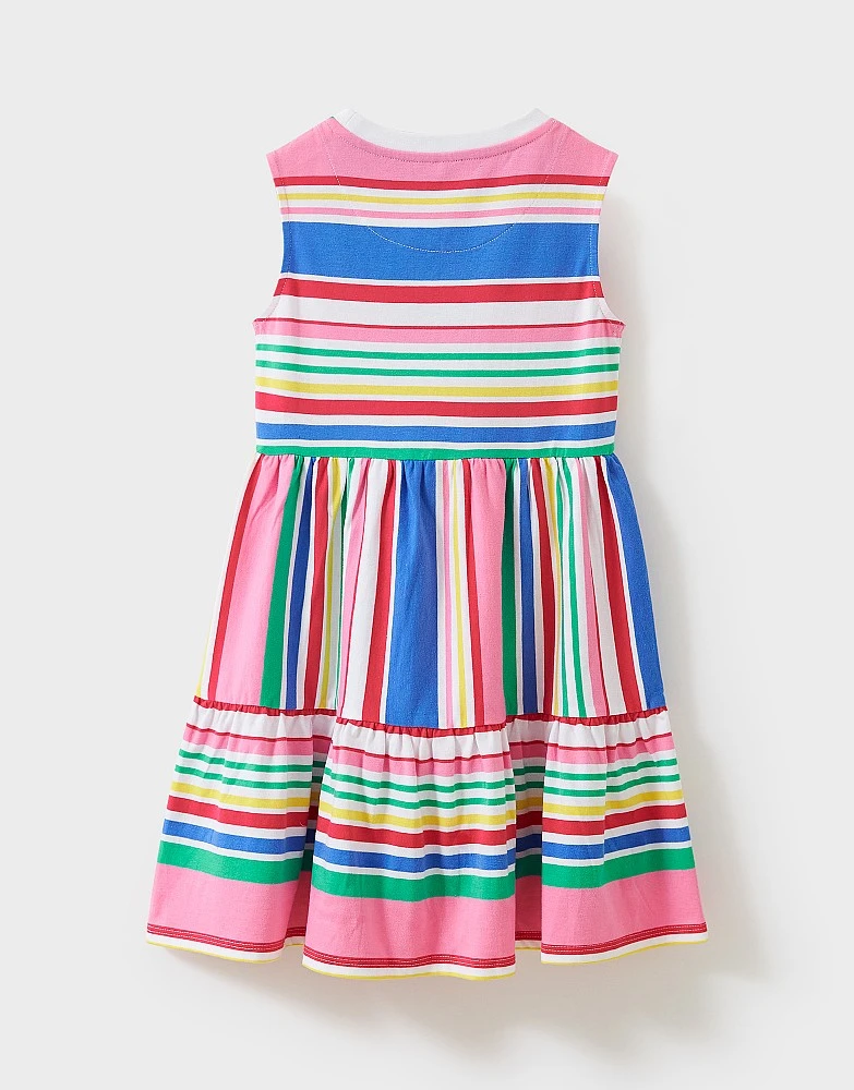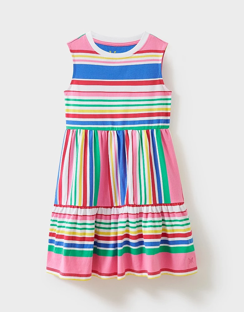 A multicoloured jersey dress. This features a popsicle stripe print and gathered tiers, creating a pretty twirl-worthy skirt. Style solo with a cardigan and sandals – your little princess will thank you this summer.
