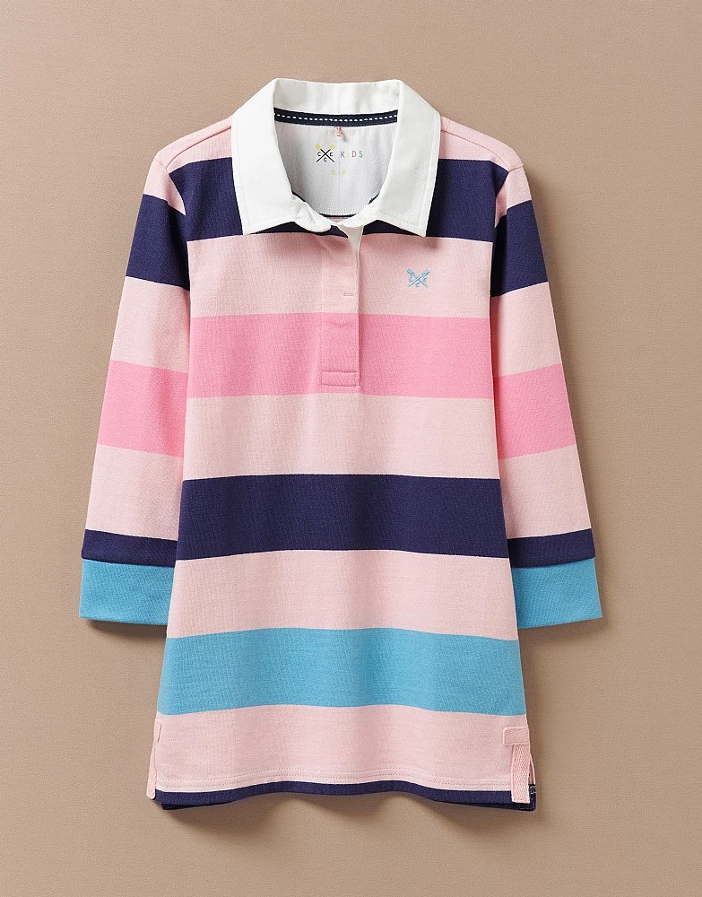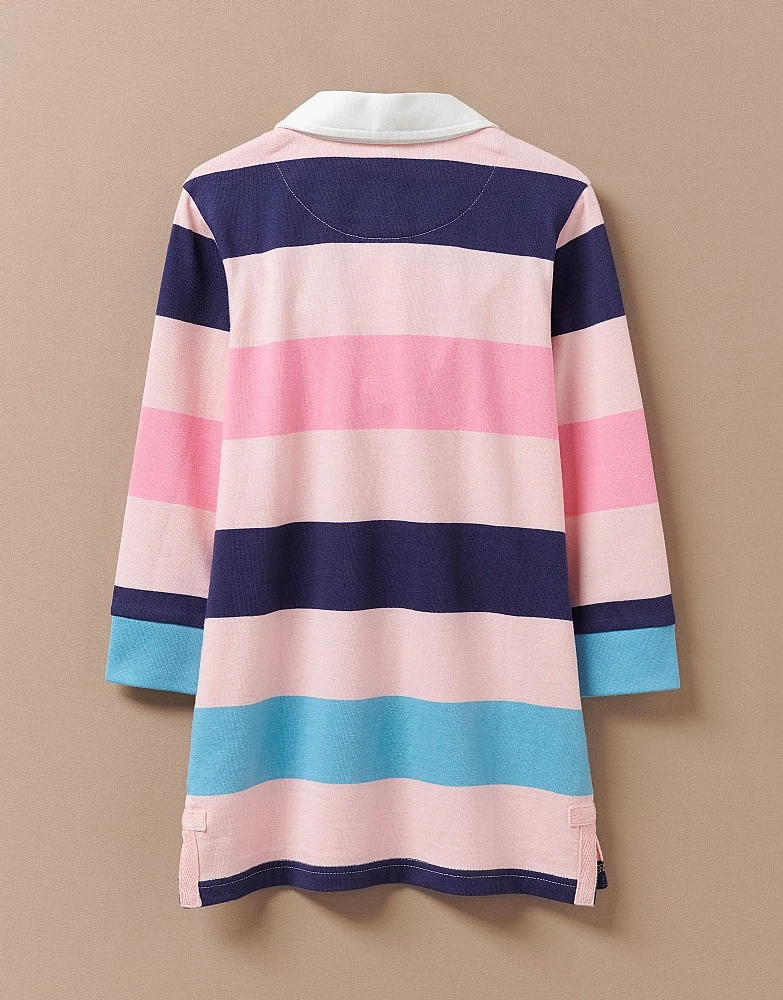 A long sleeve rugby shirt dress in a pink and blue stripe. Sporty and ultra-stylish, this dress takes the elements of a rugby and reimagines them in dress form. It’s a winner.