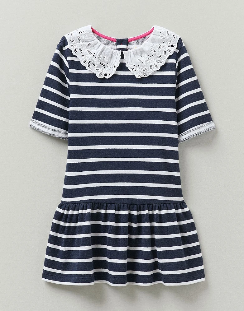 A blue and white striped dress. The drop waist peplum hem gives this a trapeze shape that’s ultra-cool while the broderie collar adds fun and style points. Even the buttons at the back are really pretty.