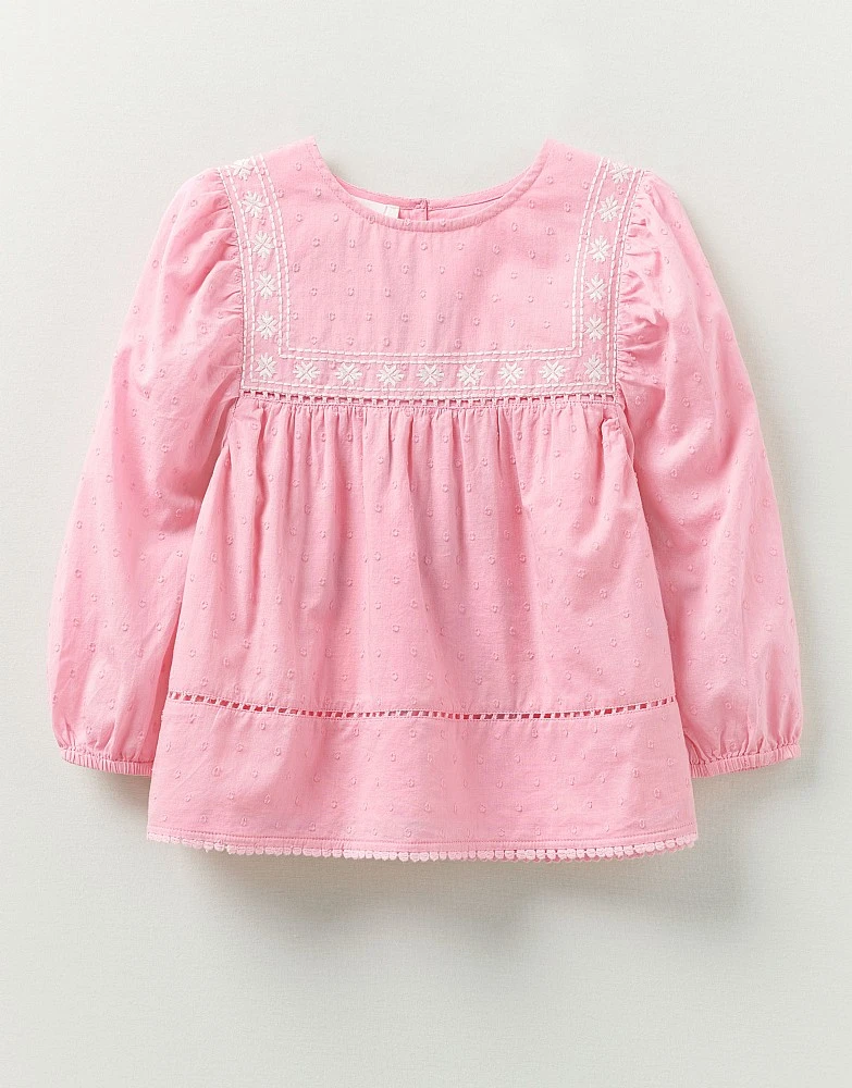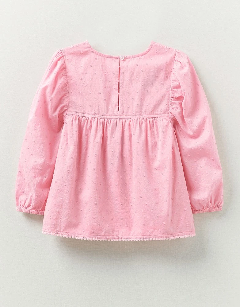 A pink long sleeve smock top. The pretty pattern, heart-shaped buttons, frill details… they’ll love wearing this. Partner with a cardi and jeans for style you’ll want to copy yourself.