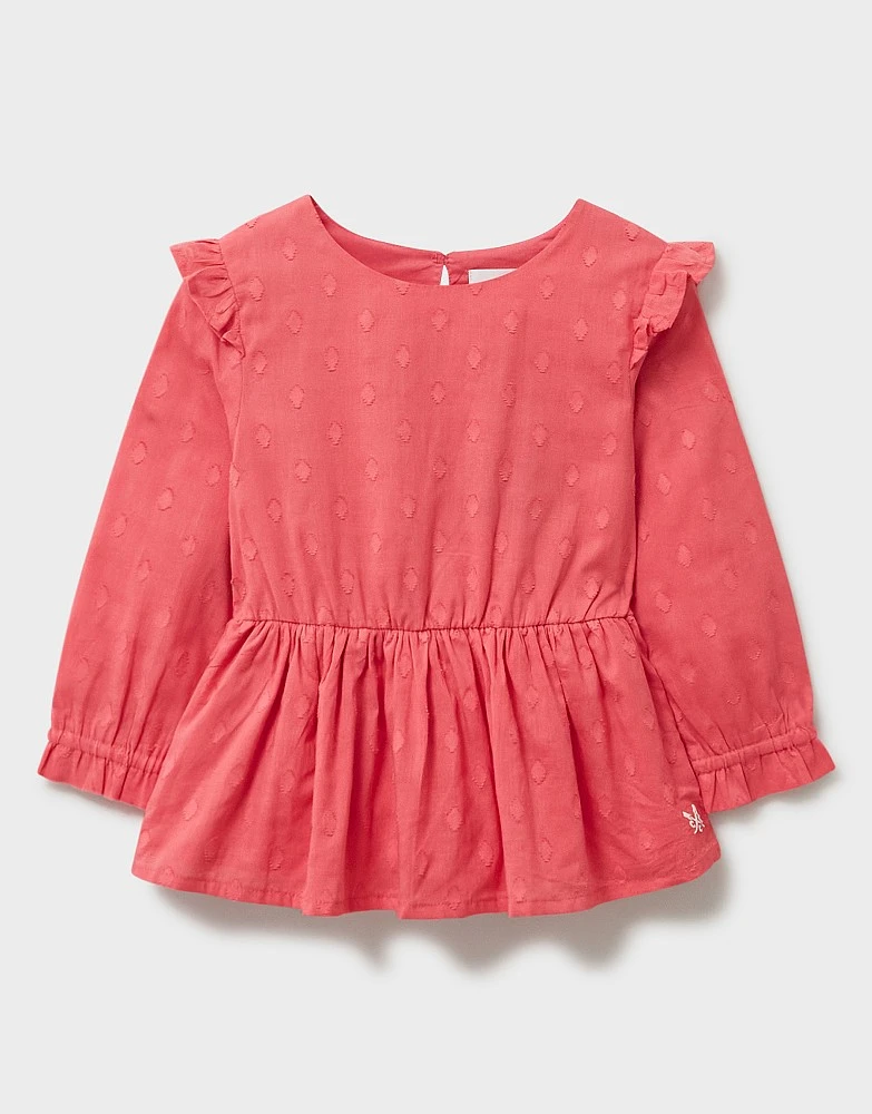 A coral blouse. The cotton dobby fabric has a summery all-over dot while the peplum shape and frills on the sleeves and cuffs give a dreamy look. It’ll look ever-so-cute with jeans or shorts.