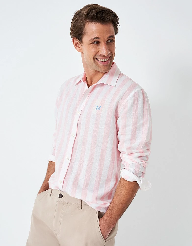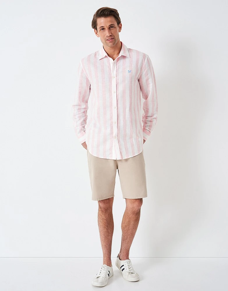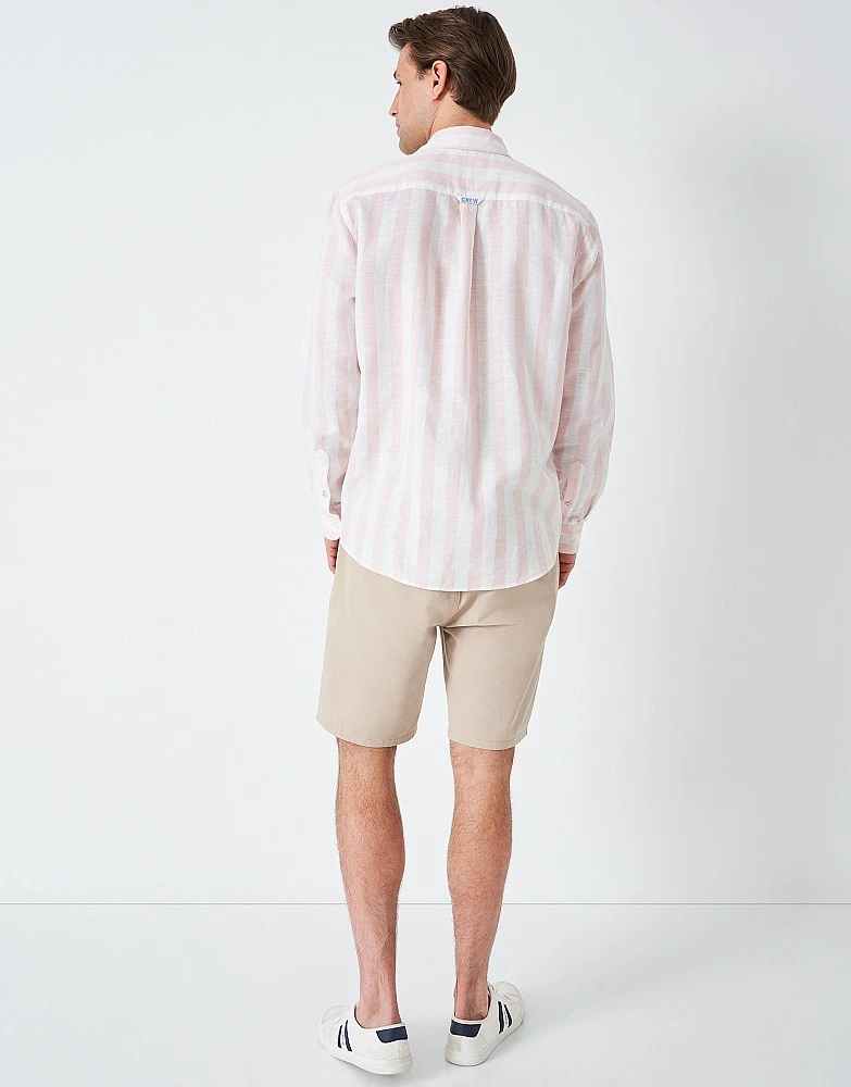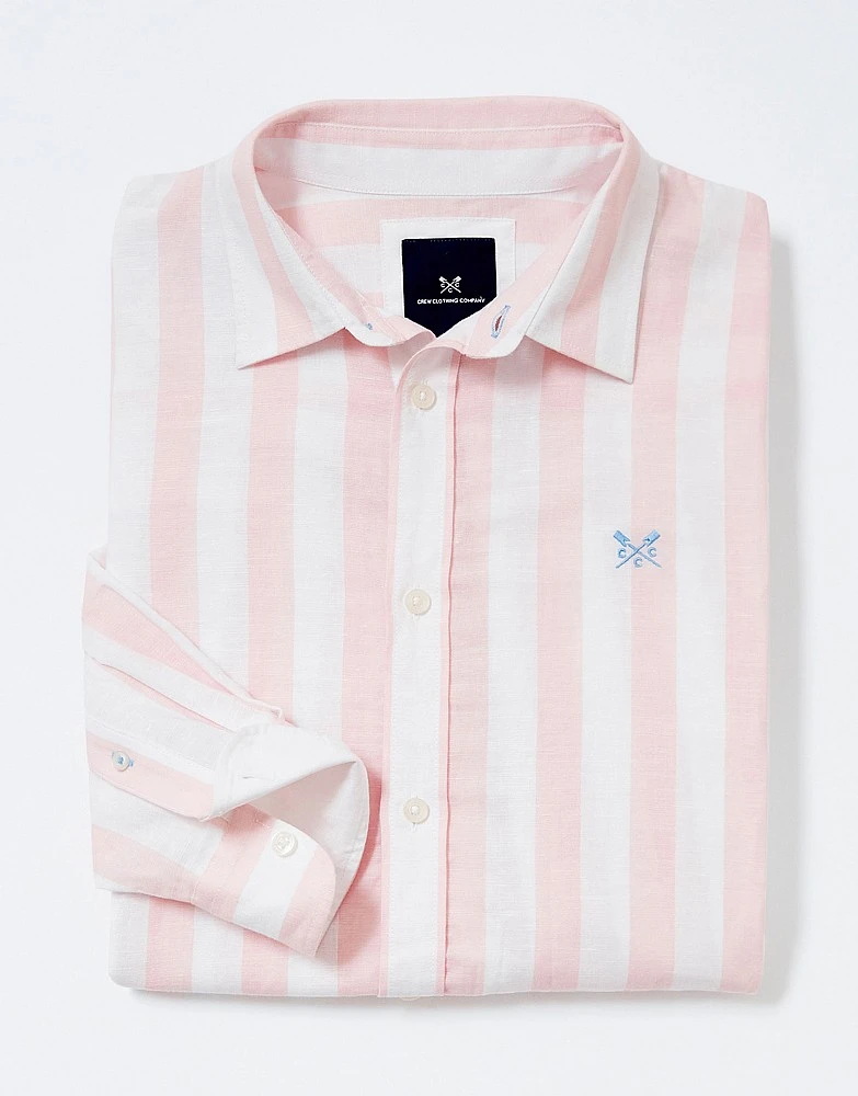 A long sleeve linen shirt in pink and white stripes. A wardrobe staple that’s perfect for warmer days. The material will keep you cool, while looking effortlessly pulled-together. It looks equally good worn loose as it does with the sleeves rolled up, tucked into chinos.