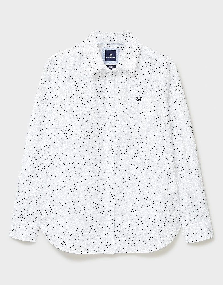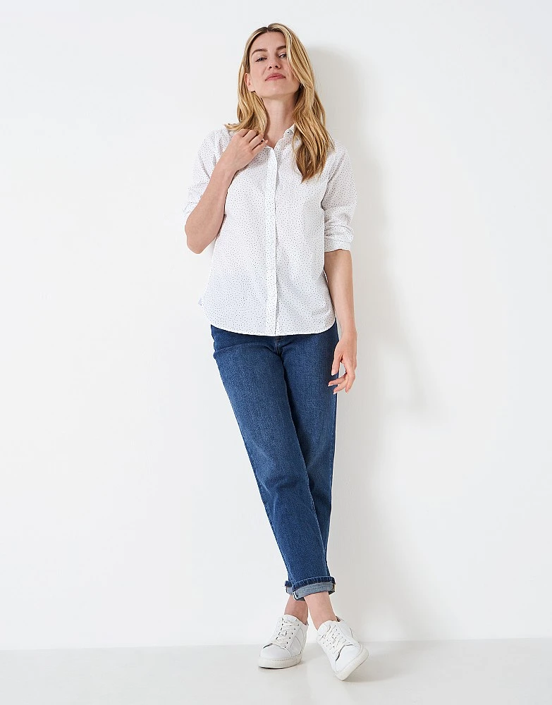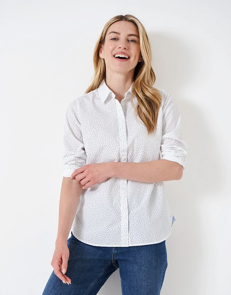 A white and navy spotty shirt. This soft shirt has been expertly tailored for a feminine look and is perfect for layering under a jumper or tucking into jeans. The print is as pretty as a springtime morning.