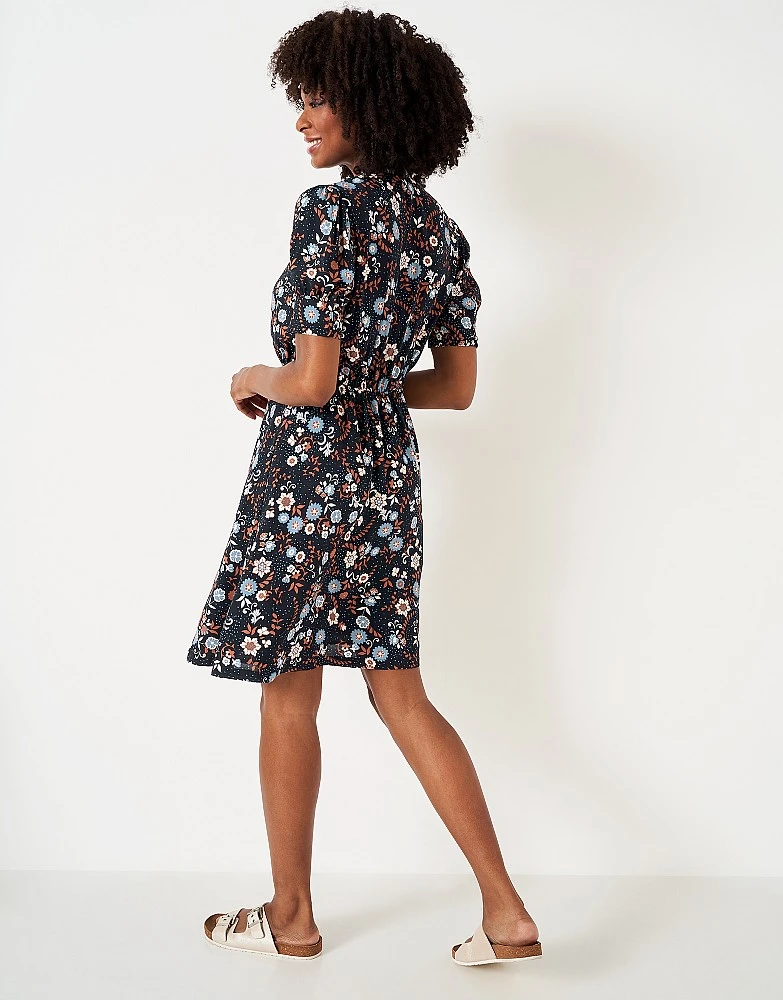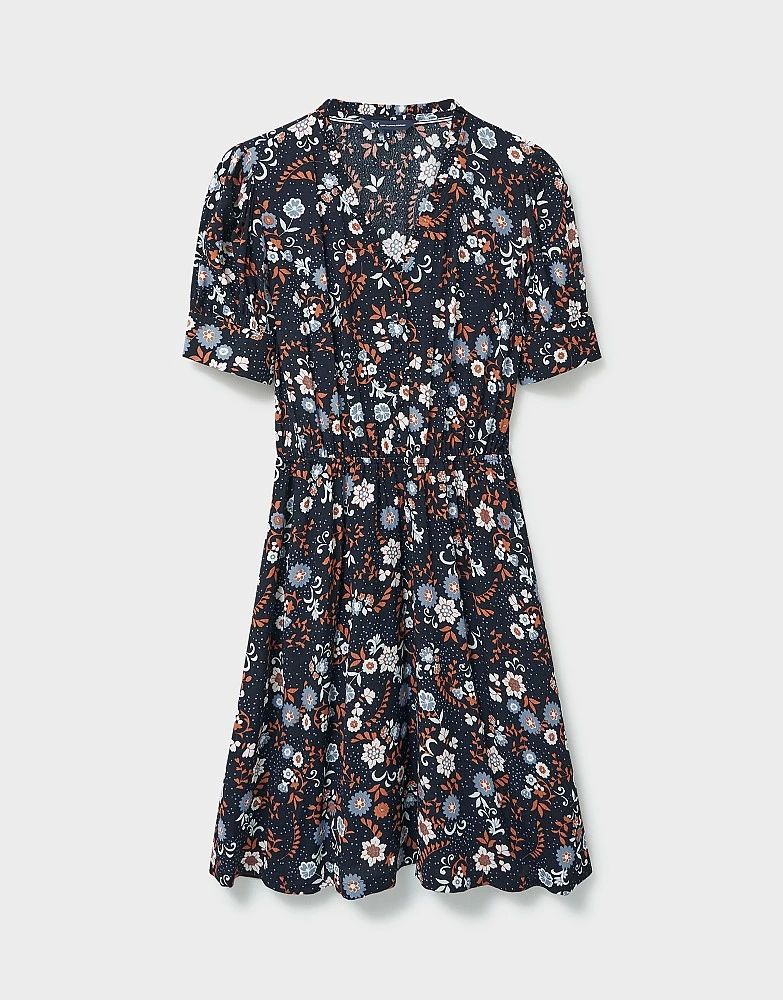Meet Lyra, our short dress in a navy floral print. We’ve made this pretty dress with an elegant button neckline and flattering cuffed sleeves. The elasticated waist cinches you in, adding extra shape to this relaxed design. Simply add our leather trainers.