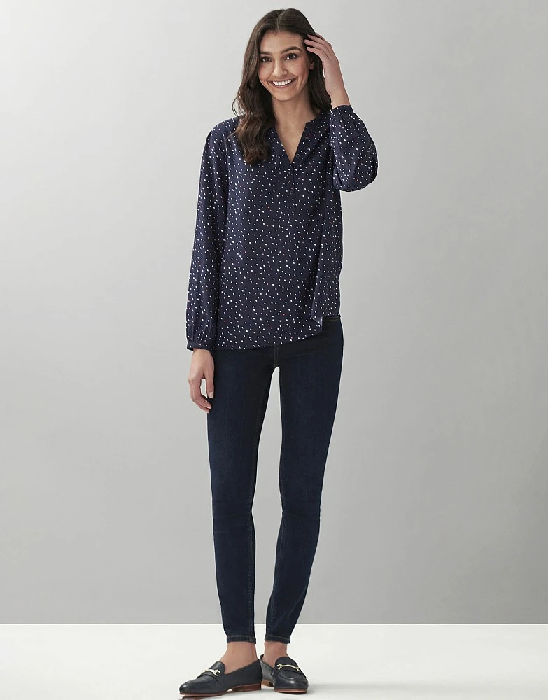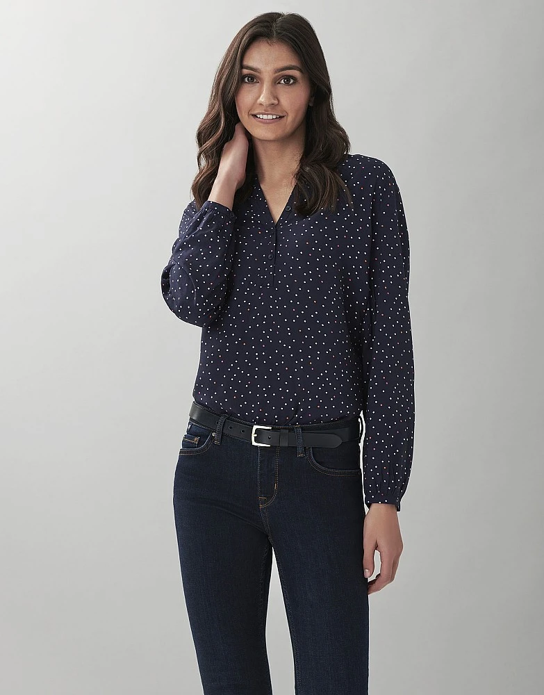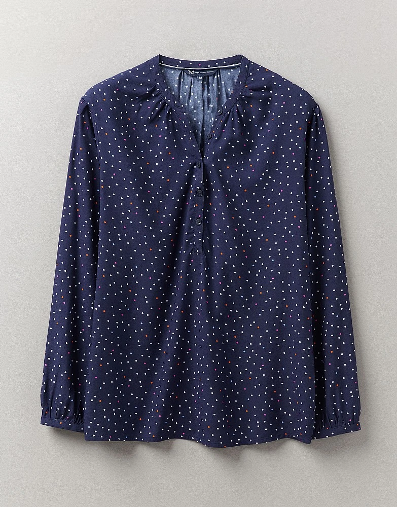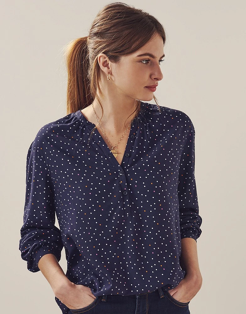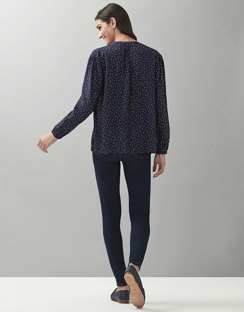 Endless styling options await with our Maggie top in navy and a multicolour dot. This blouse has a button-down neckline, bracelet length sleeves and cuffs finished with a button detail. It looks great worn loose or tucked into jeans or skirts. A versatile staple with a flowy, feminine shape.
