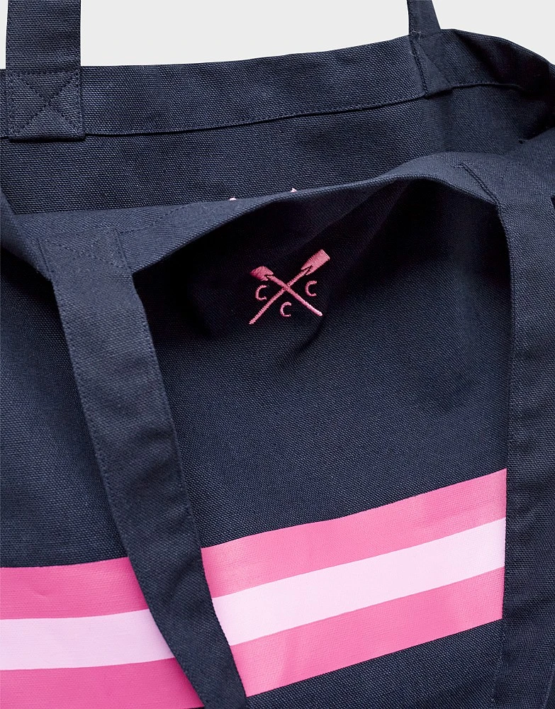 A navy and pink striped canvas shopper, crafted from organic cotton. Durable, effortlessly simple and with room for all your essentials, this is the perfect ‘pack up and go’ accessory. An everyday staple.