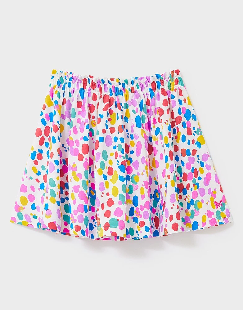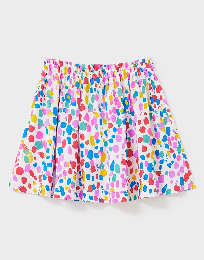 A multicoloured skirt in an abstract spotty print. This skirt is made for dancing with all its layers and fullness – perfect for summer playdates. It just waltzed into our must-haves.