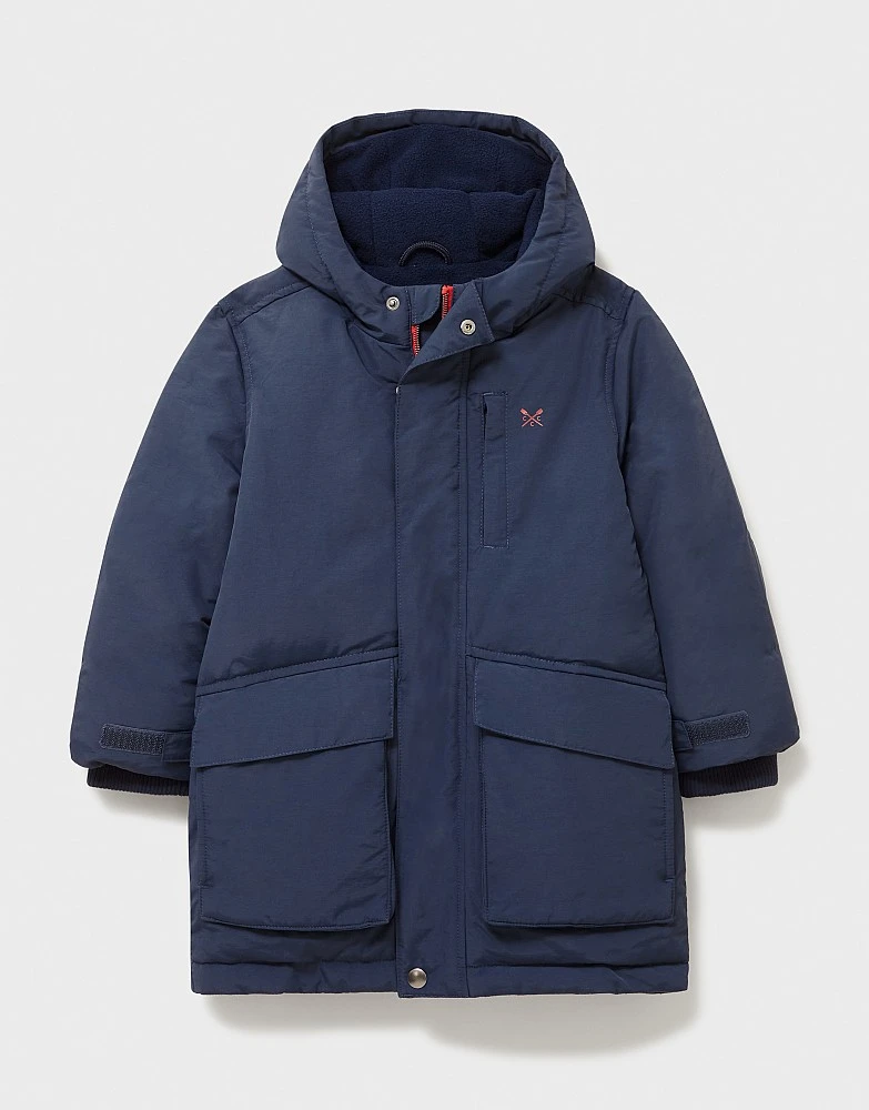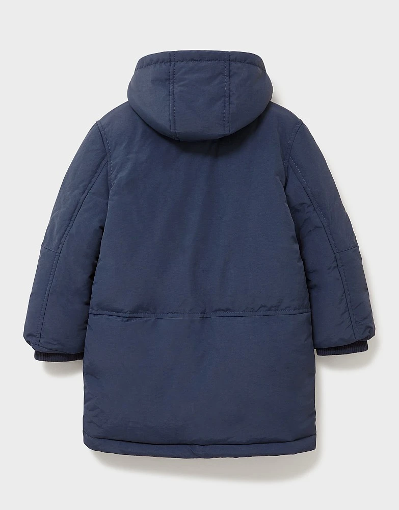 A boys parka jacket in blue. Designed with a hood and soft ribbed cuffs, this comfortable coat is perfect for taking on rainy days. Just add wellies for a puddle-proof ensemble.
